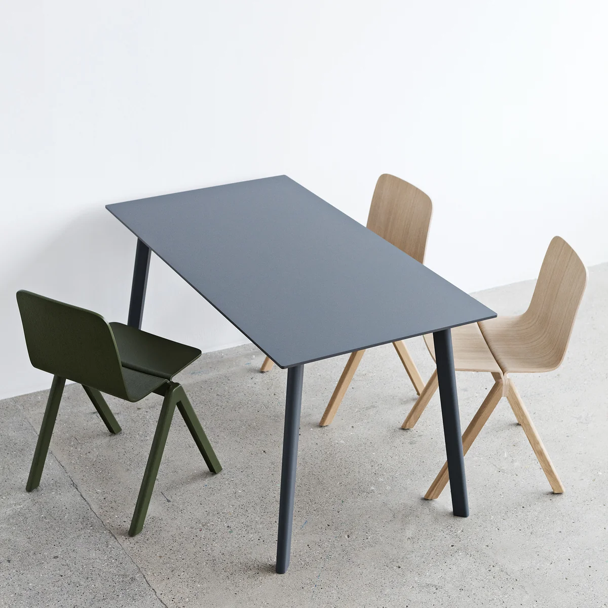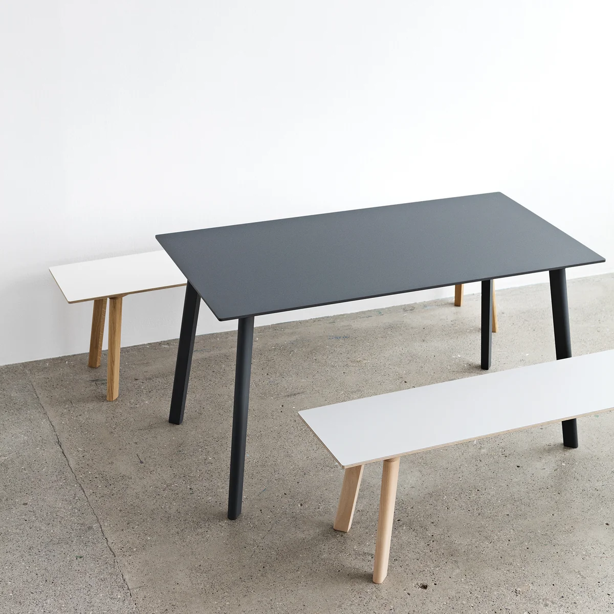 The special feature of the 140 cm-long bench is located in the surface finish: With the help of latest nanotechnology, HAY has developed a laminate that produces a matte soft-touch surface, which is not only extremely easy to clean, but also doesn’t get fingerprints on the seating surface. The four legs, however, are made from lacquered oak, which set natural accents.
