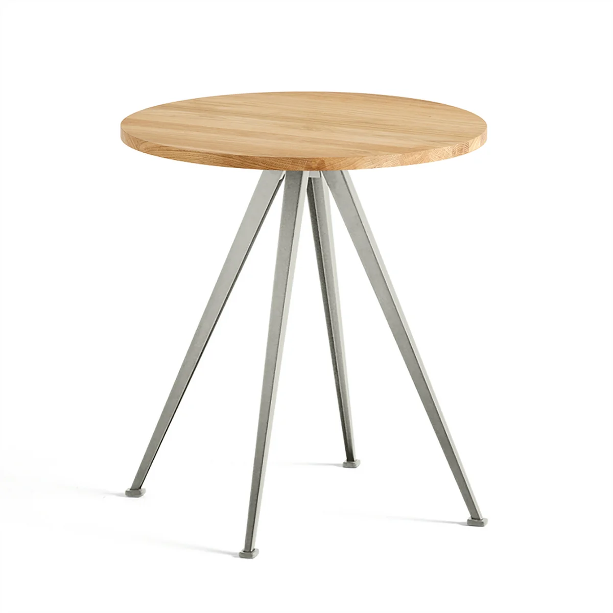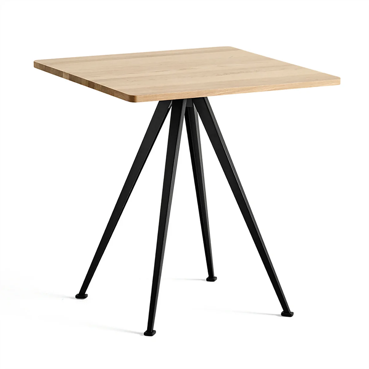 As part of the series, the Pyramid bistro table 21 is characterised by its four-legged, pyramid-like running base. Made from powder-coated steel, the table has an industrial style that is particularly eye-catching. The tabletop made from oak, whose grain is clearly visible, provides warm, soft highlights.