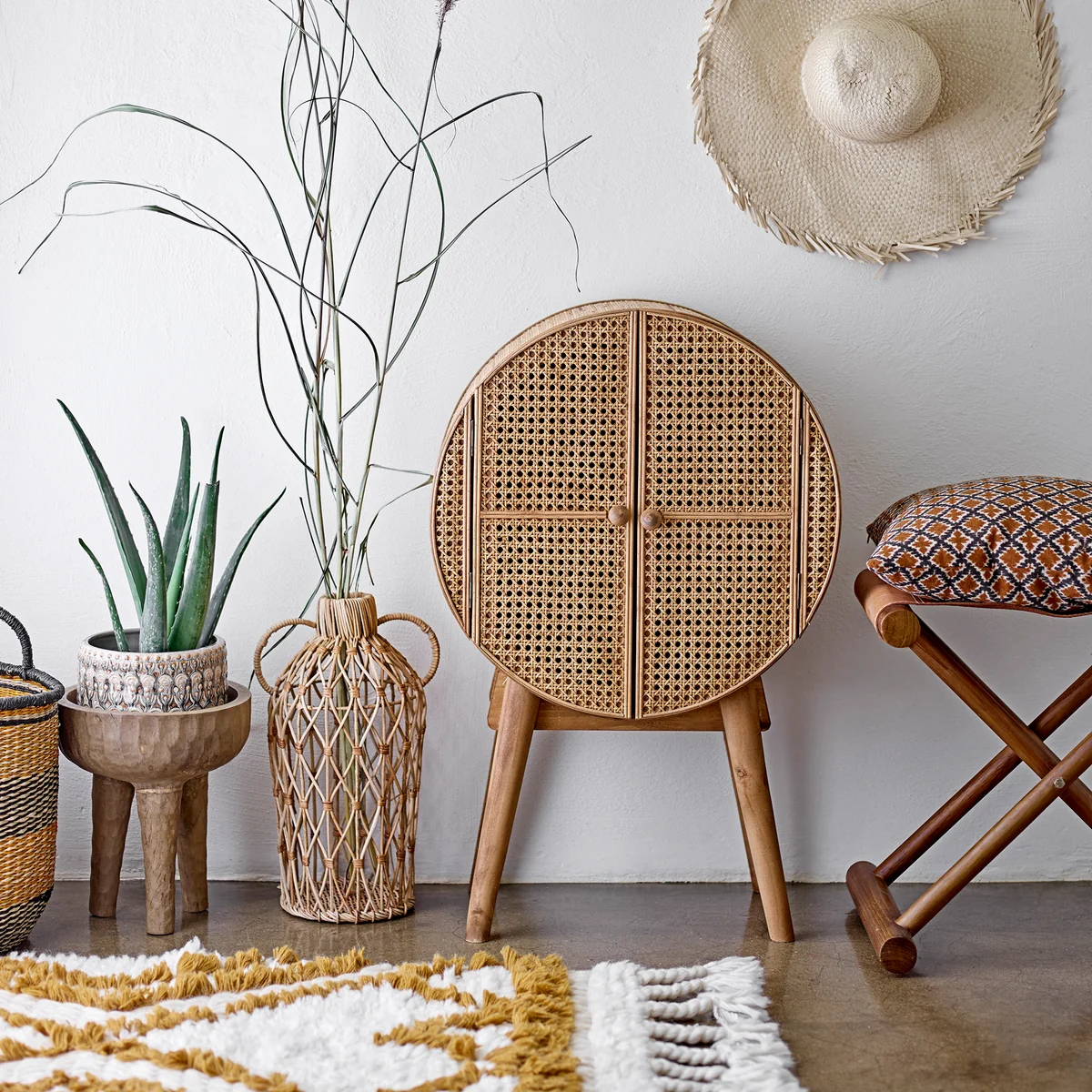 The Otto cabinet from Bloomingville is a decorative cabinet with an unusual shape. Compact in design, the Otto cabinet consists of a four-legged frame made of spruce wood and a round cabinet element with walls and doors made of rattan. The round shape stands out and is an eye-catcher in any room. At the same time, the 80 cm high cabinet offers plenty of storage space for a wide variety of items.