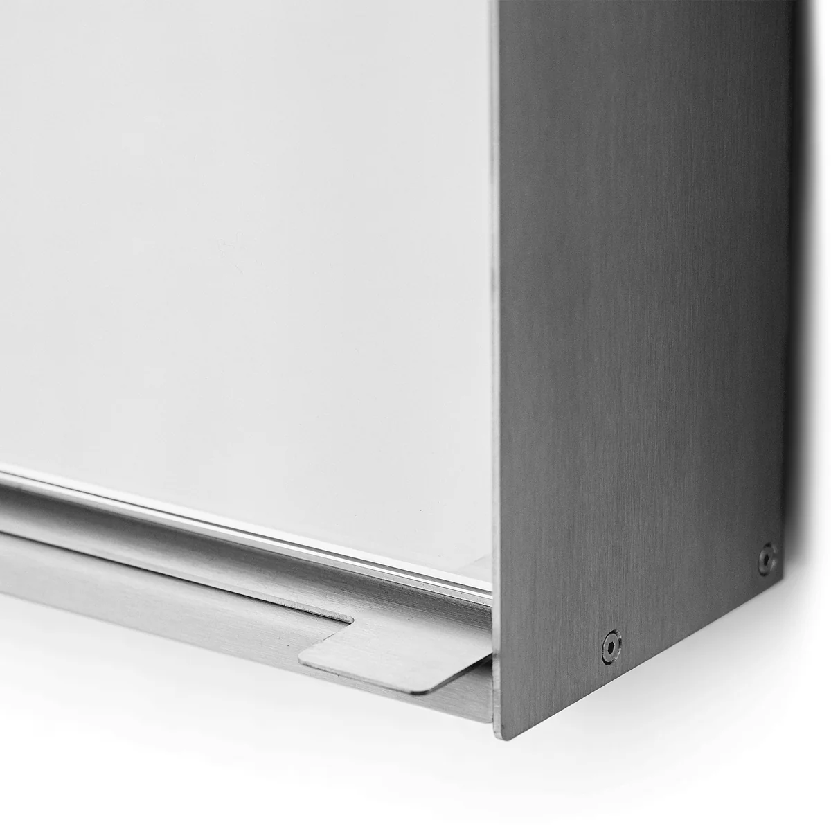 Angled brackets on the back provide stability while maintaining the open, light appearance. The gently rounded edges emphasize the high-quality craftsmanship and give the raw steel profiles a pleasantly smooth, tactile surface. Behind the mirror is a concealed, narrow storage space that allows important utensils to be stored neatly and within easy reach - for a tidy, minimalist ambience.