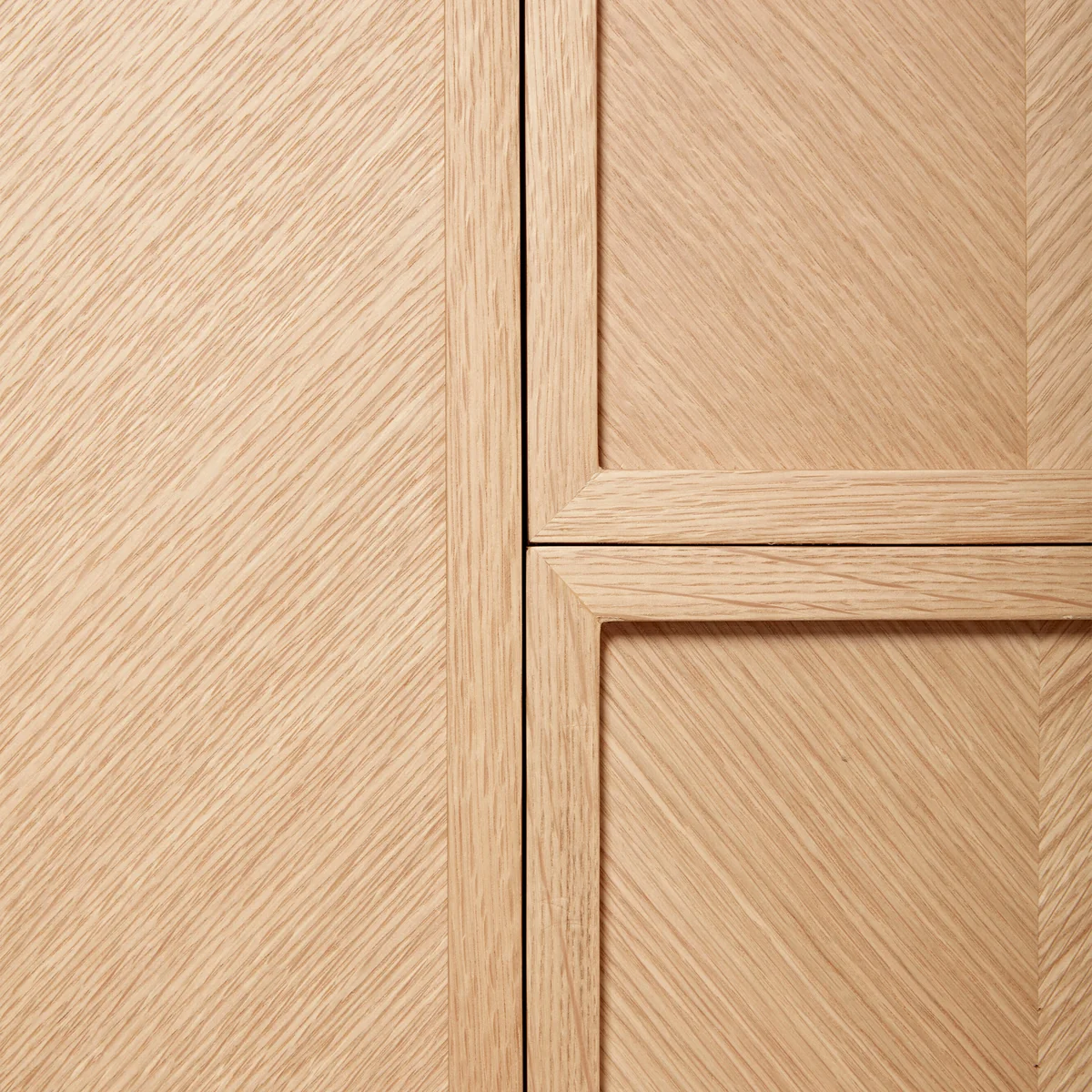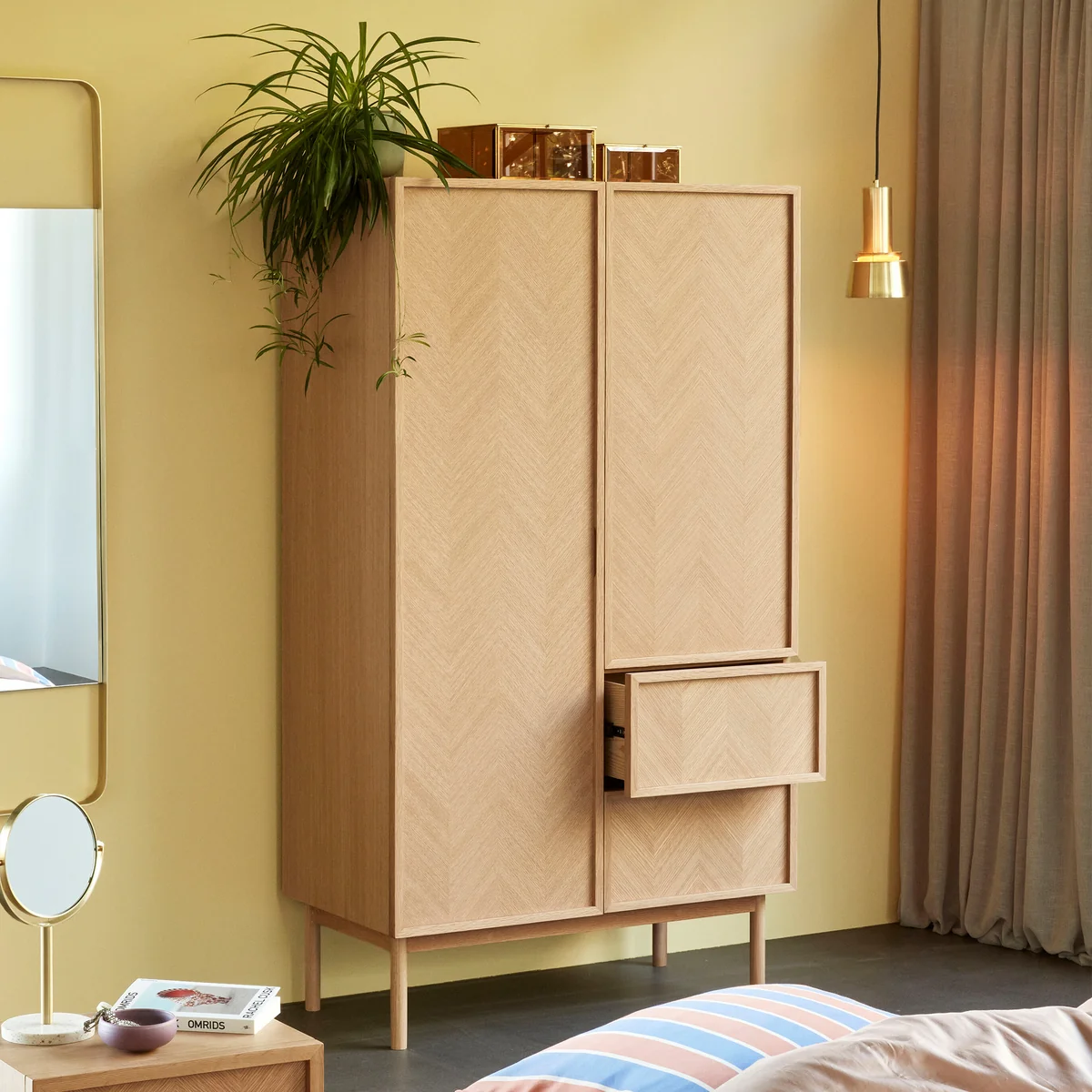 The Herringbone closet from Hübsch Interior is a masterpiece made of high-quality oak wood with an elegant herringbone pattern. This closet combines Scandinavian design with functional aesthetics and offers generous storage space for your clothes and accessories. The warm, natural oak wood color blends harmoniously into any interior and gives your room a cozy yet stylish atmosphere. With its robust construction and fine handcrafted details, the Herringbone closet is not only a practical piece of furniture, but also a timeless highlight in your home.