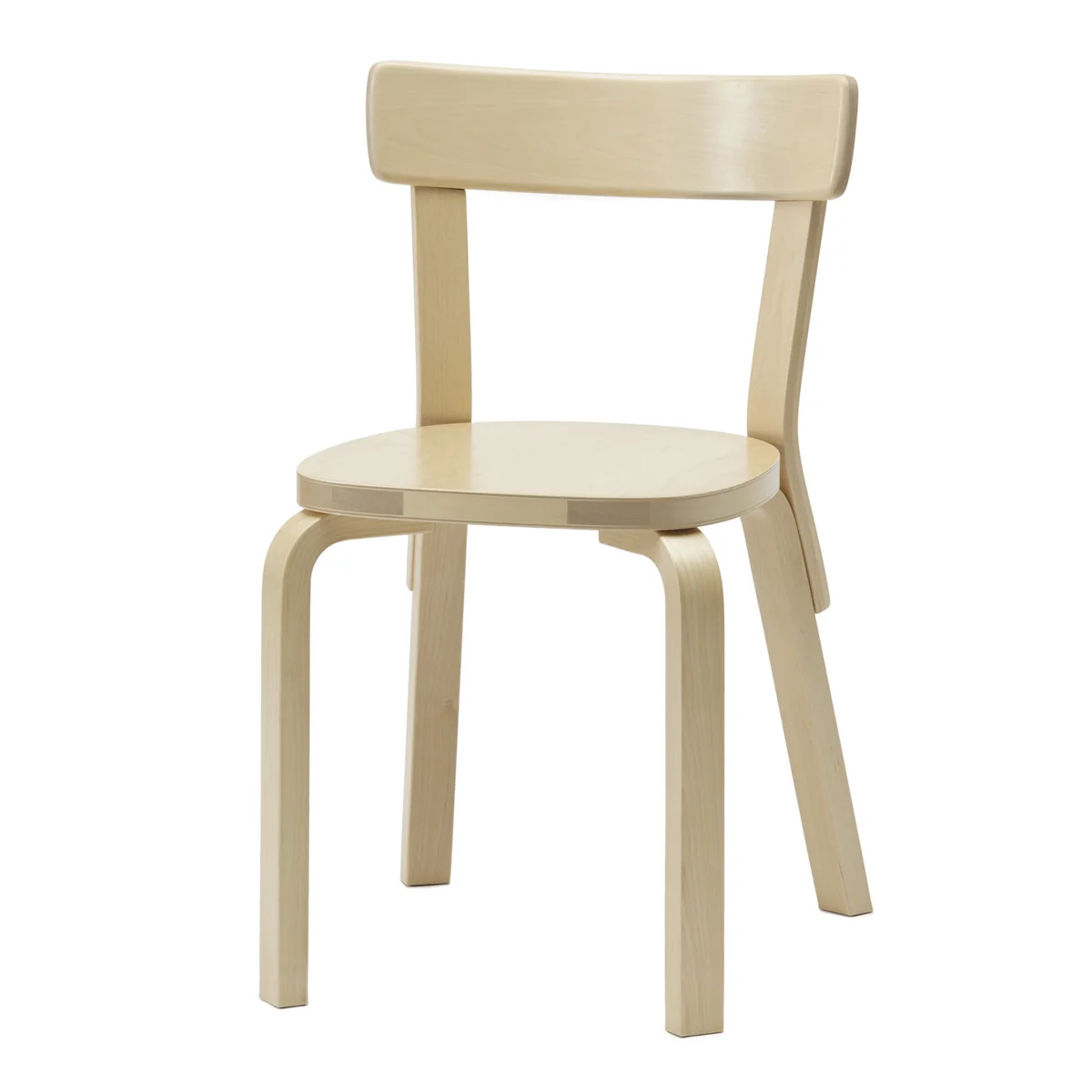 Artek manufactures the Chair 69 from birch veneer, which in another step is varnished transparent. There are also versions with laminated or cushioned seats available.
