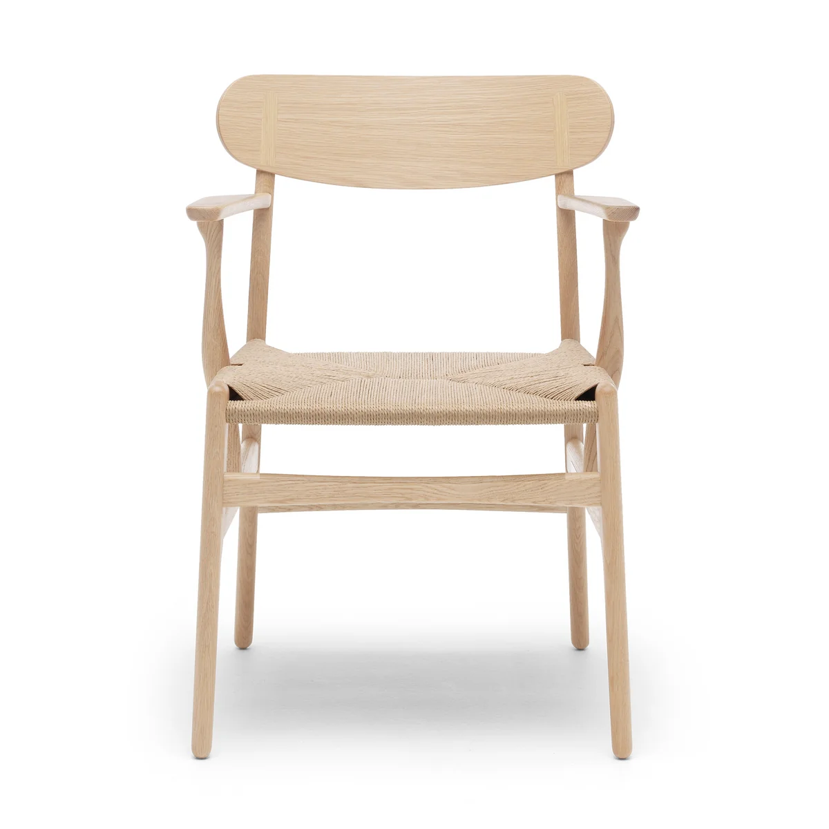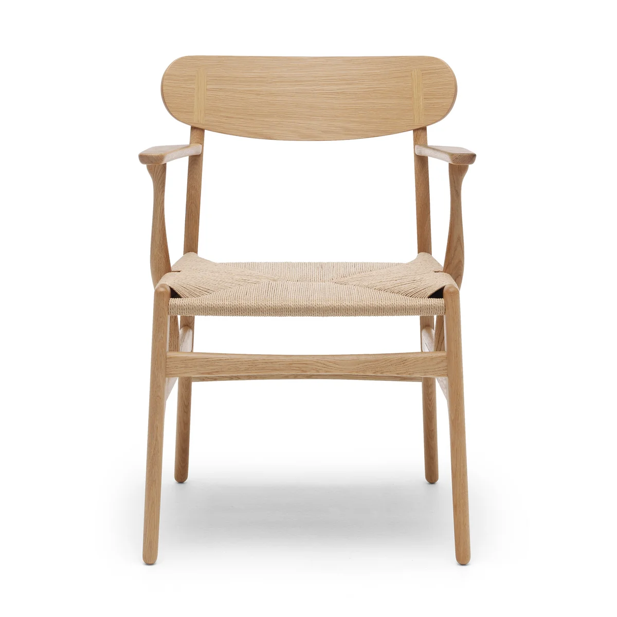 The CH26 was designed by Wegner exclusively for Carl Hansen & Søn, but never went into production. The revised version impresses with its organic shape, bold backrest and woven seat. Sitting for long periods at the desk or dining table becomes a comfortable CH26 becomes a comfortable affair. The chair with armrests consists of a four-legged frame made of oak wood or walnut. The seat is made of paper yarn in black or natural in elaborate and careful handwork. The paper yarn, actually a substitute for leather or similar in times of war, proves to be very sturdy and durable. Wegner was a big fan of this material and used it for many of his chairs.