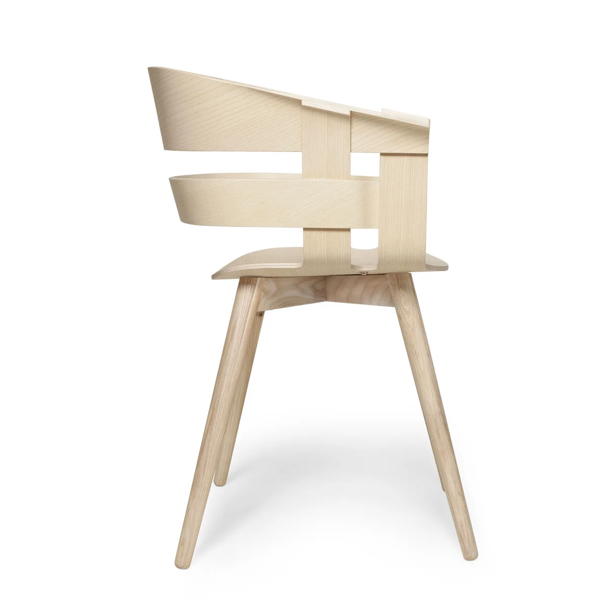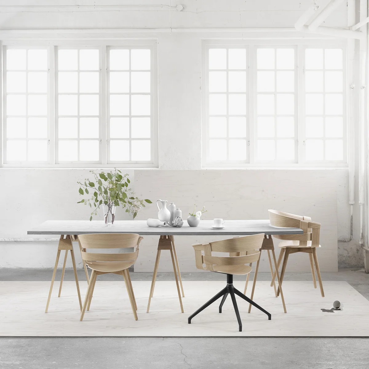 The Wick Chair is available in various versions. Firstly there is a choice of different types of wood like natural oak, black lacquer or natural ash. Secondly, different bases are available in wood, steel or rotating legs. This way, the chair can be adjusted for use in different areas both as a classic dining chair as well as in the office or conference area.