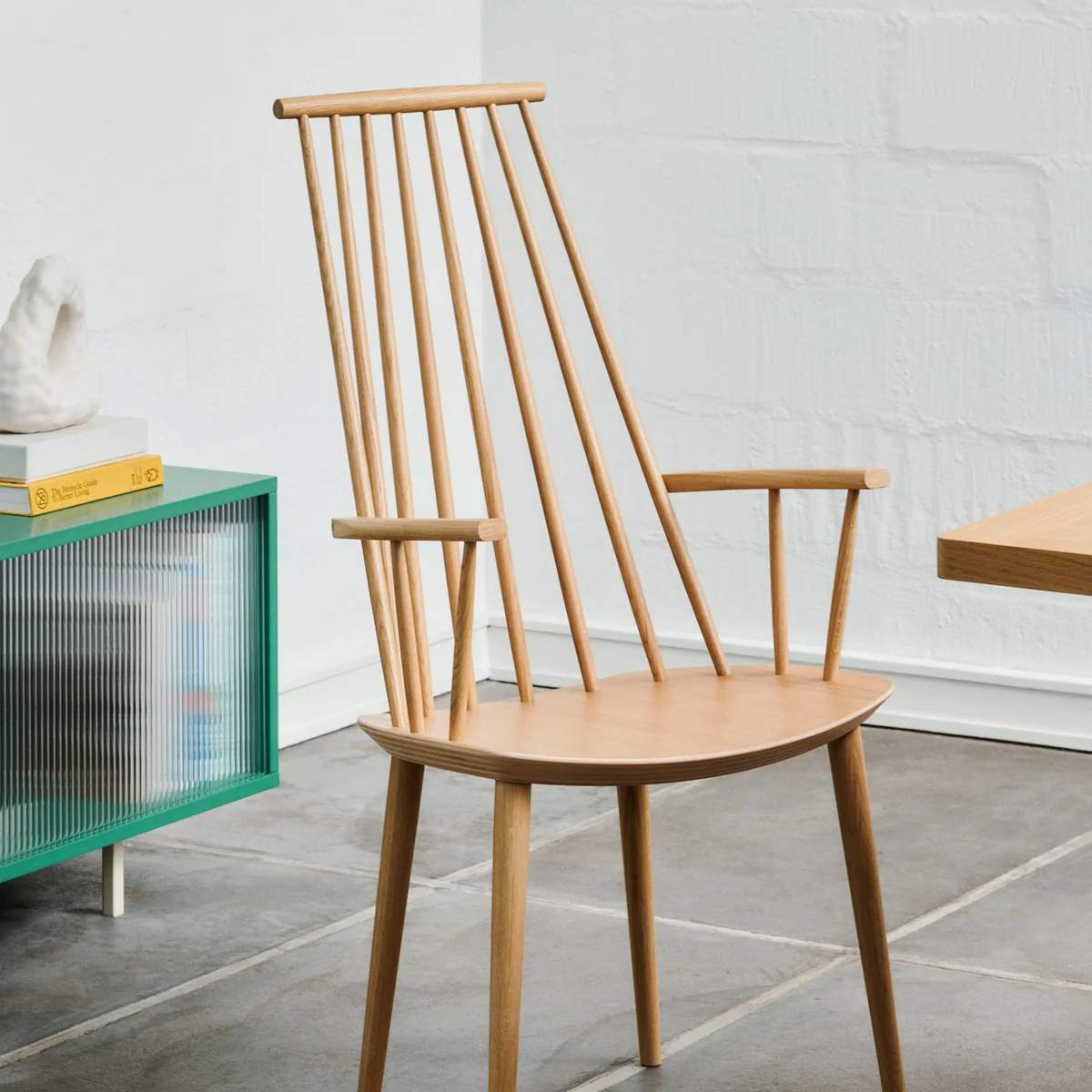 HAY manufactures the J110 Chair from beech wood. With a seat height of 44.5 cm, the J110 from HAY is perfect for the dining table, while its high seat back has the effect of an armchair:: The wide seat and high backrest give the J110 an unusually high level of comfort for dining table chairs.