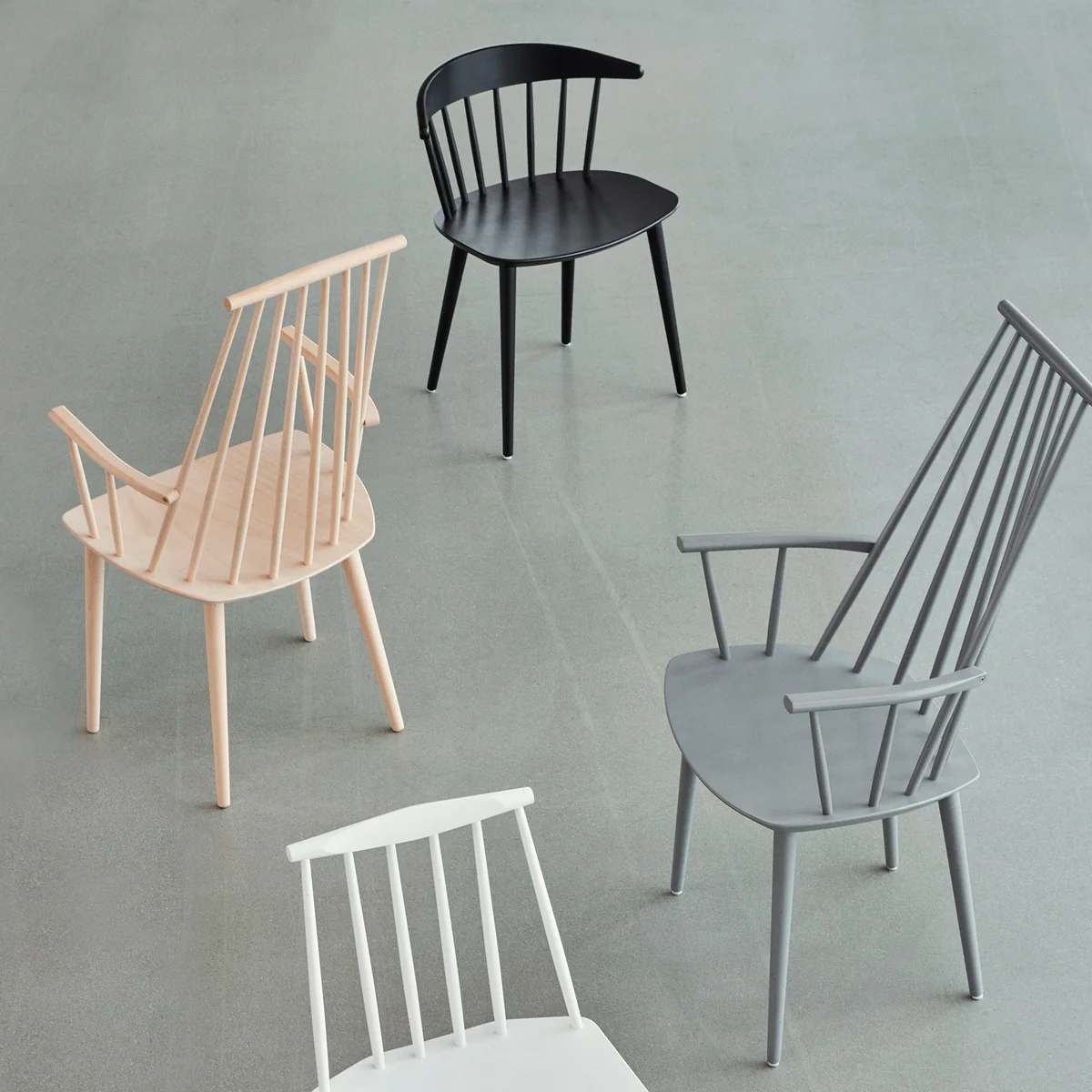 Originally the J110 Chair was designed with the idea of democratising good and functional design: Borrowing from the typical Windsor chairs of the 1 8. century, the J110 interprets the slender wooden rods and high backrest in a timeless design. The slenderness of the rods and the material structure make the dining chair from HAY appear stable and light at the same time. For these reasons, the J110, produced by FDB at the time, quickly became a success.