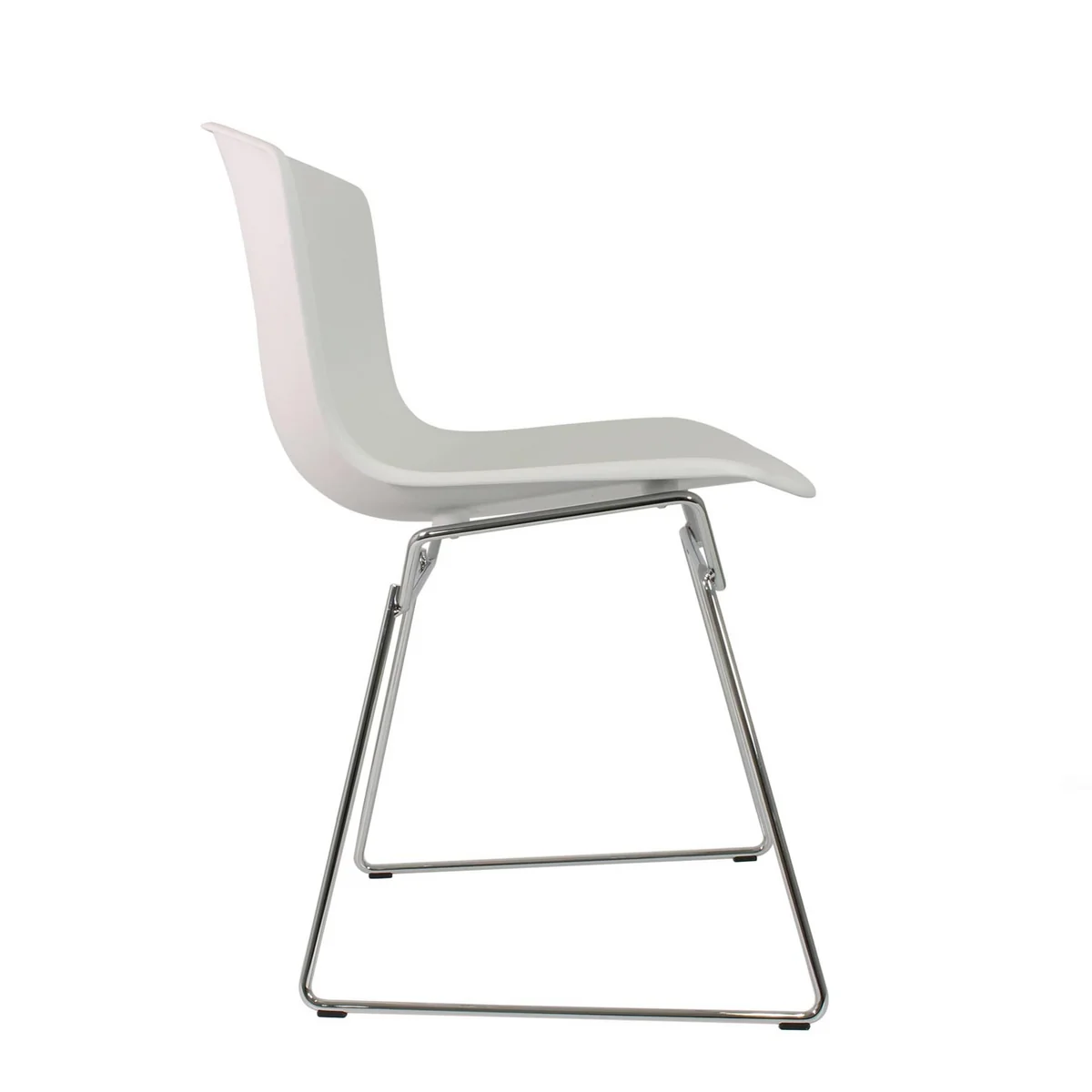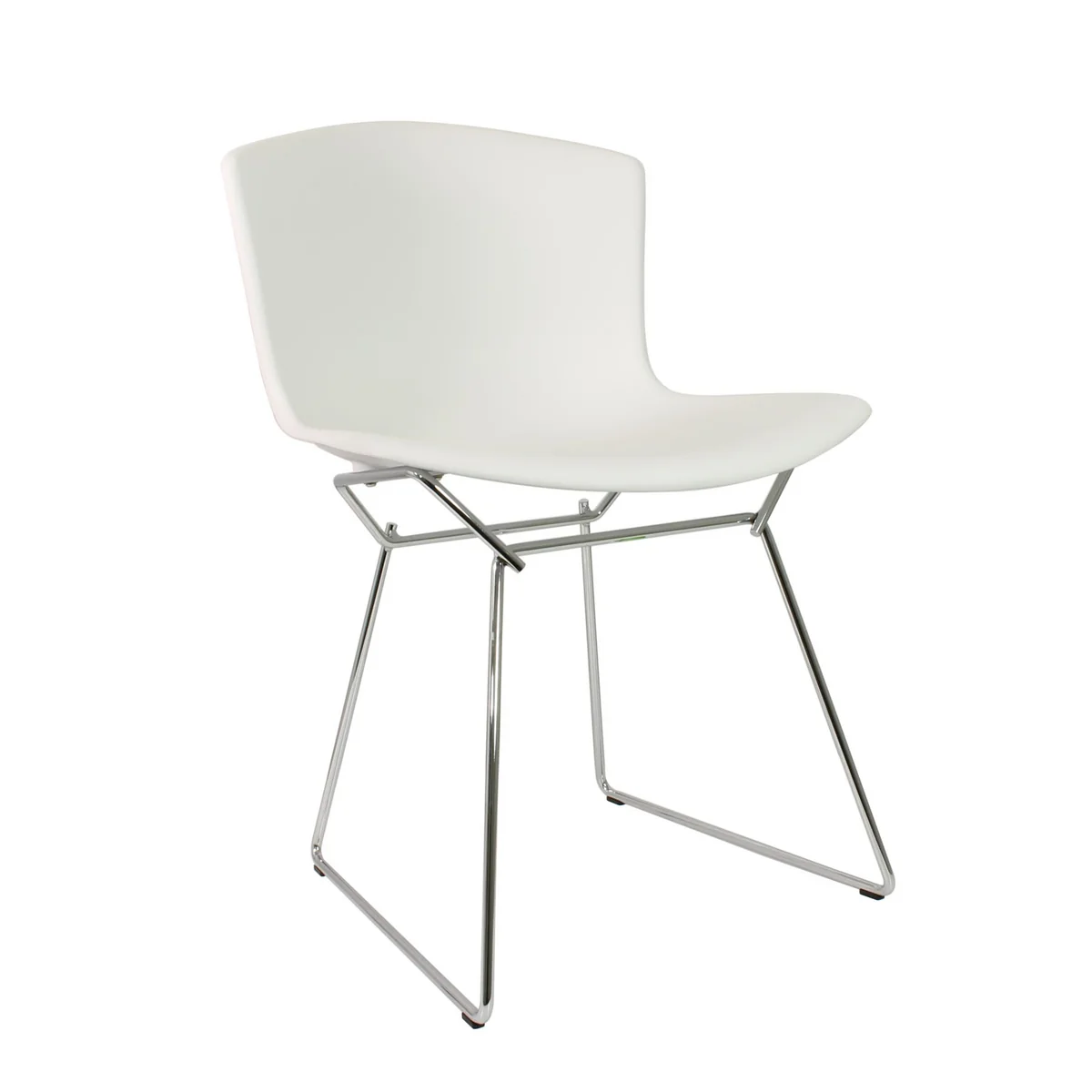 The plastic chair is a variation on the Bertoia wire frame family, all of which are hand-drawn and hand-welded in a highly complex process. The Bertoia plastic chair consists of a plastic seat shell in various colors and a welded steel profile, which is available chromed or, on request, with a white or black paint finish.