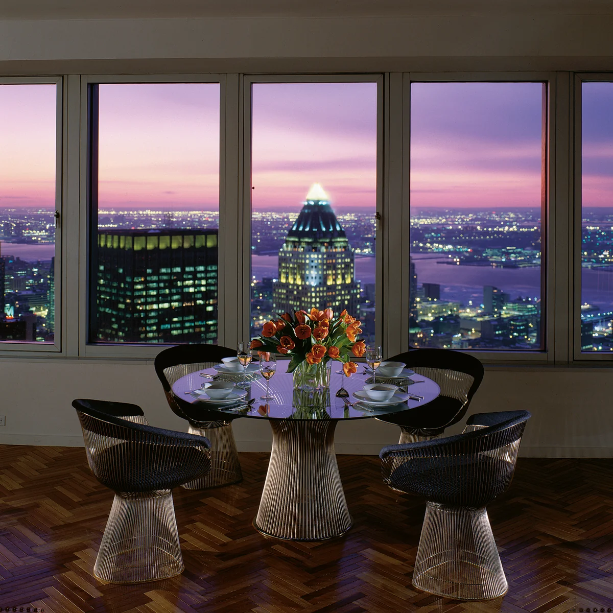 The Platner armchair consists of hundreds of curved, nickel-plated steel wires that are welded together. The steel frame serves as both a structure and a decorative element. Knoll manufactures the seat shell from fiberglass with cold foam cushions. The underside of the Platner armchair has a transparent plastic ring on the underside that protects the floor and the chair from damage.