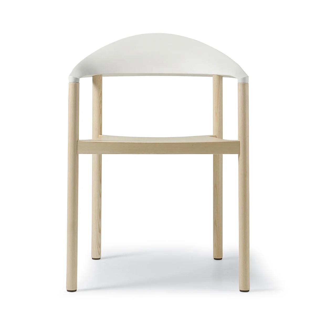 A reduced wooden construction lies at the heart of the Monza armrest chair, which is inspired formally by the typology of Scandinavian wooden chairs. Its character is defined by the plastic backrest, which on one hand ensures stability for the frame and on the other also gives the chair comfort and colour.