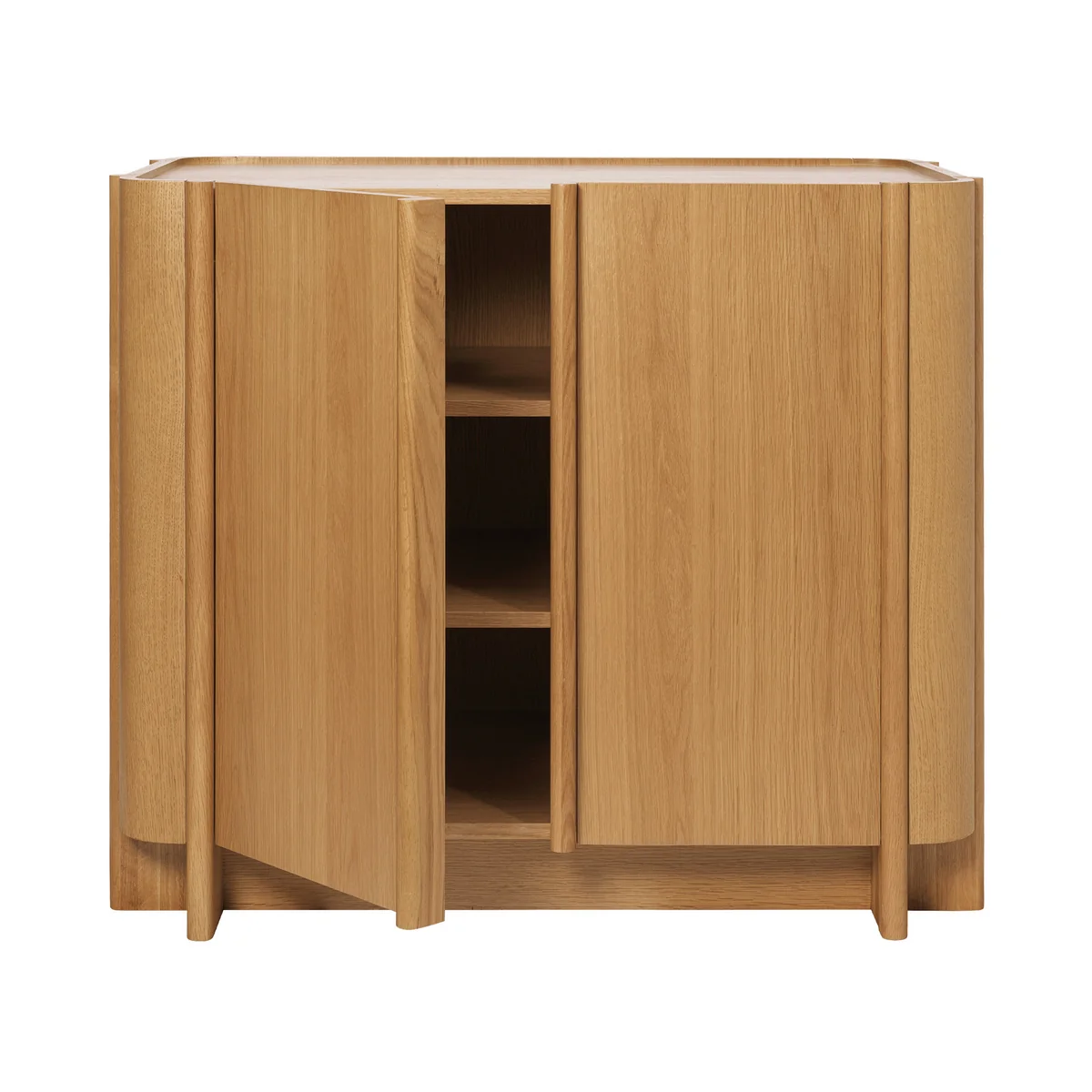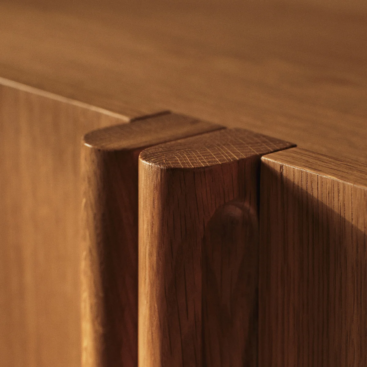 The Tilu chest of drawers from Ferm Living impresses with its clear form and characterful details. Made from oak, the sculptural legs give the piece of furniture a strong, modern presence. Adjustable shelves and soft-closing doors make the chest of drawers a versatile storage solution for the living room, bedroom or children's room. In combination with the Tilu changing unit , an elegant changing station can also be created.