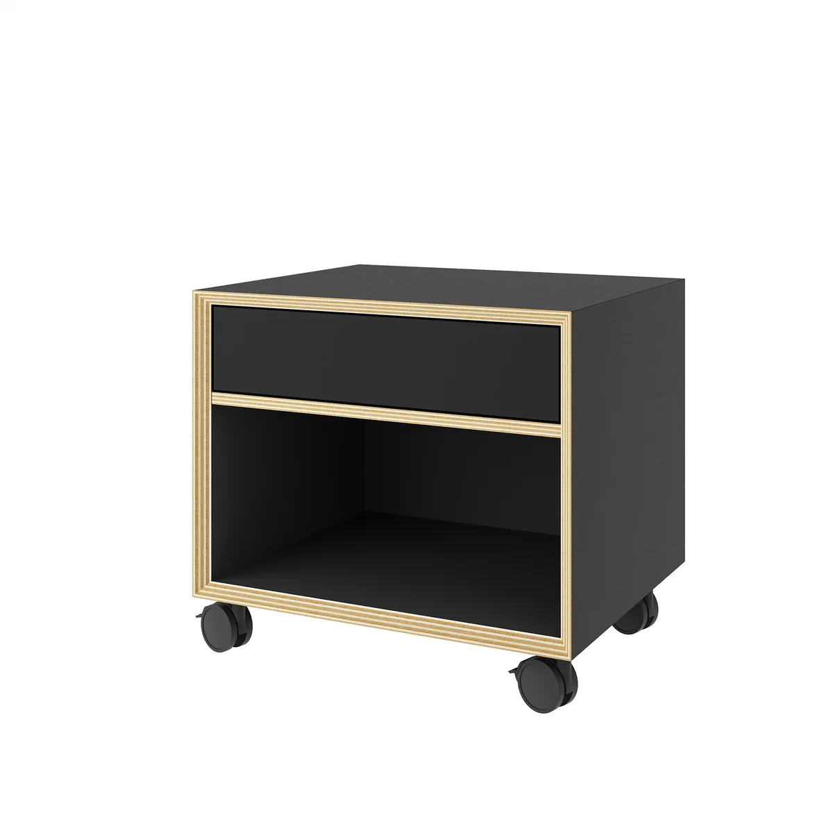 The Vertiko small chest of drawers by Sascha Sartory is a multifunctional piece of furniture that can be used flexibly as a bedside cabinet, container or side table. It is available in two versions: with a smaller drawer at the top and an open compartment at the bottom or vice versa. The chest of drawers is supplied with black 25 mm high feet as standard, but can optionally be fitted with castors (total height 480 mm) or metal feet (total height 500 mm) in black, white or anthracite.