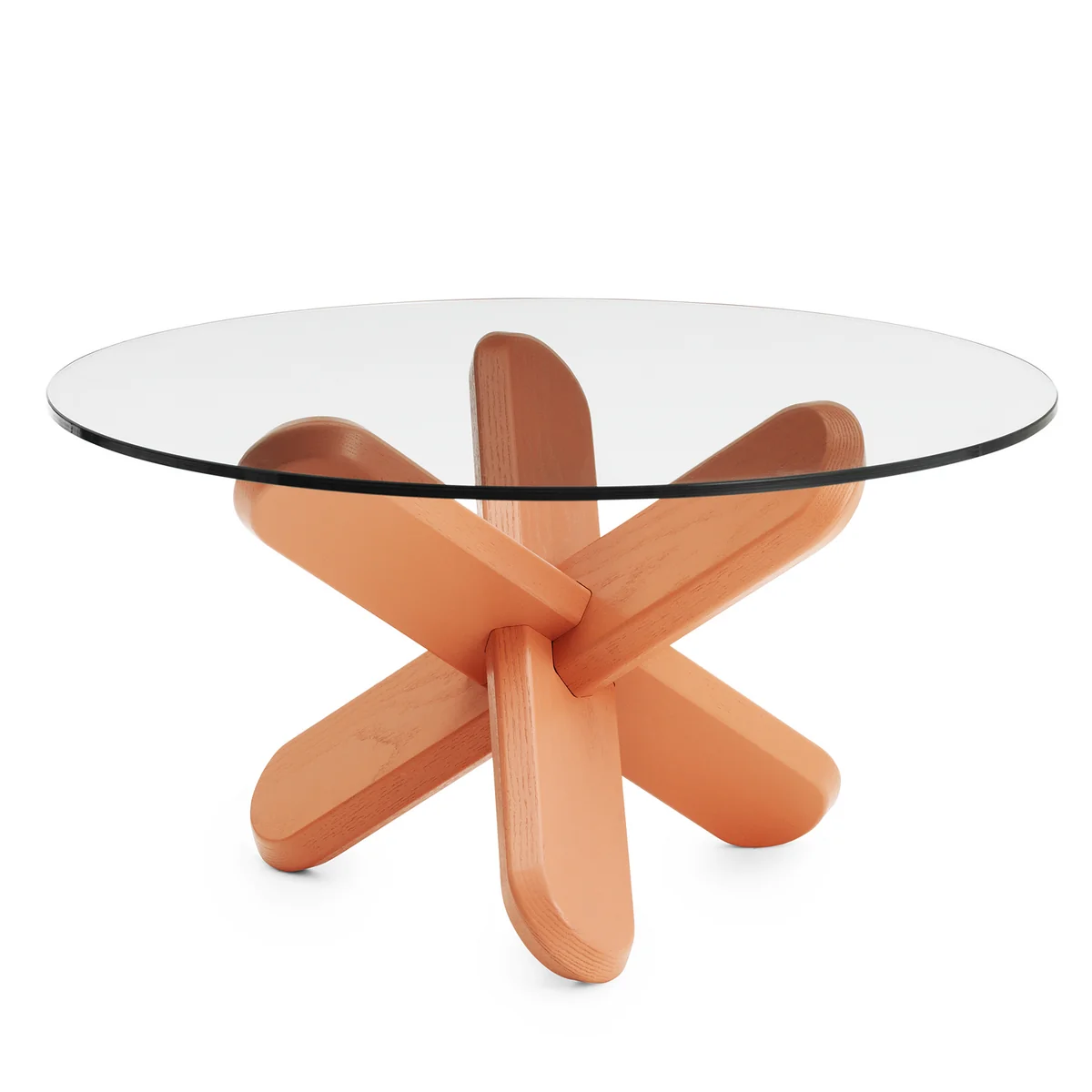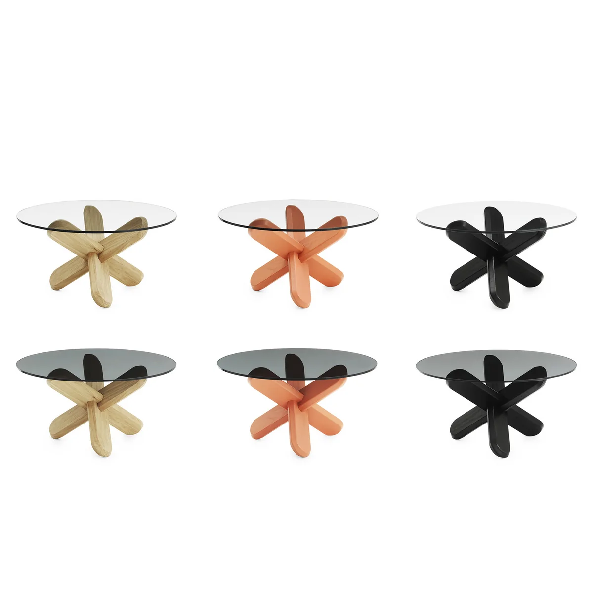 The Ding Coffee table simply consists of three legs, which are made of oak wood. When they are joined together, they form a sculptural knot that serves as the base for the round table top. The rounded, sloping legs give the Ding coffee table from Normann Copenhagen a stable stand that securely supports the glass top.