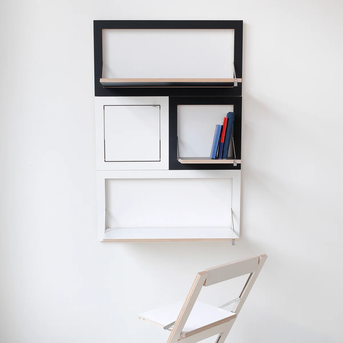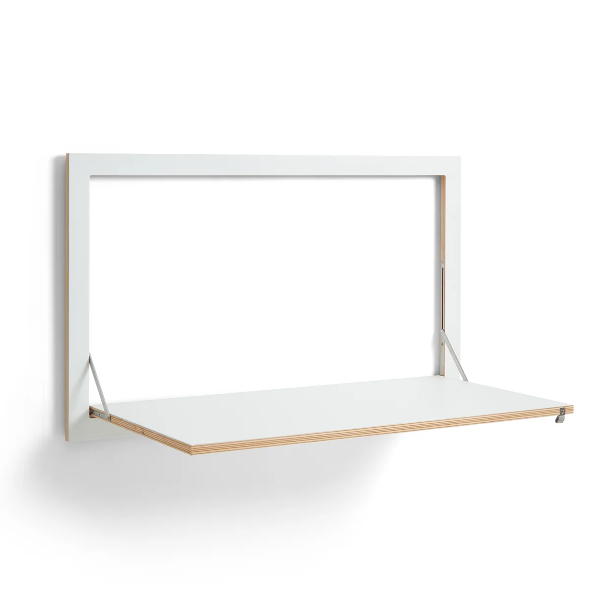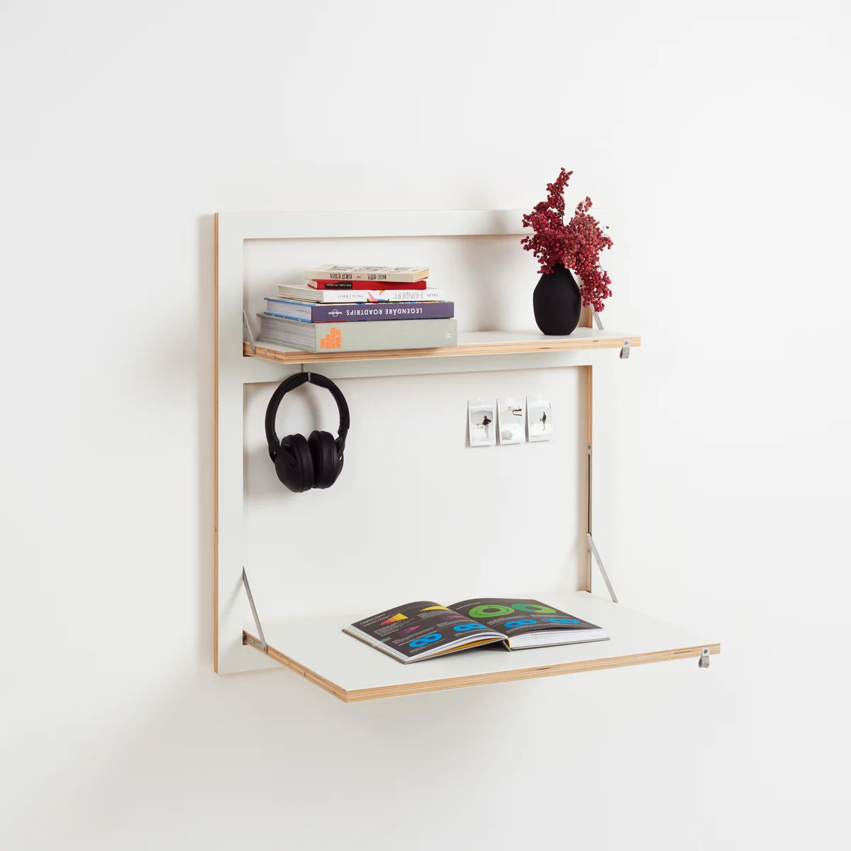 The wall-mounted secretary is made of FSC®-certified birch plywood, while the folding functions are made of stainless steel. A small felt loop makes it easier to fold out the work surface. The surfaces are lacquered by hand and are available in various colors and motifs. In white, for example, the secretary desk blends in with the wall of the same color, while a secretary desk with a motif becomes a decorative picture on the wall when folded up.