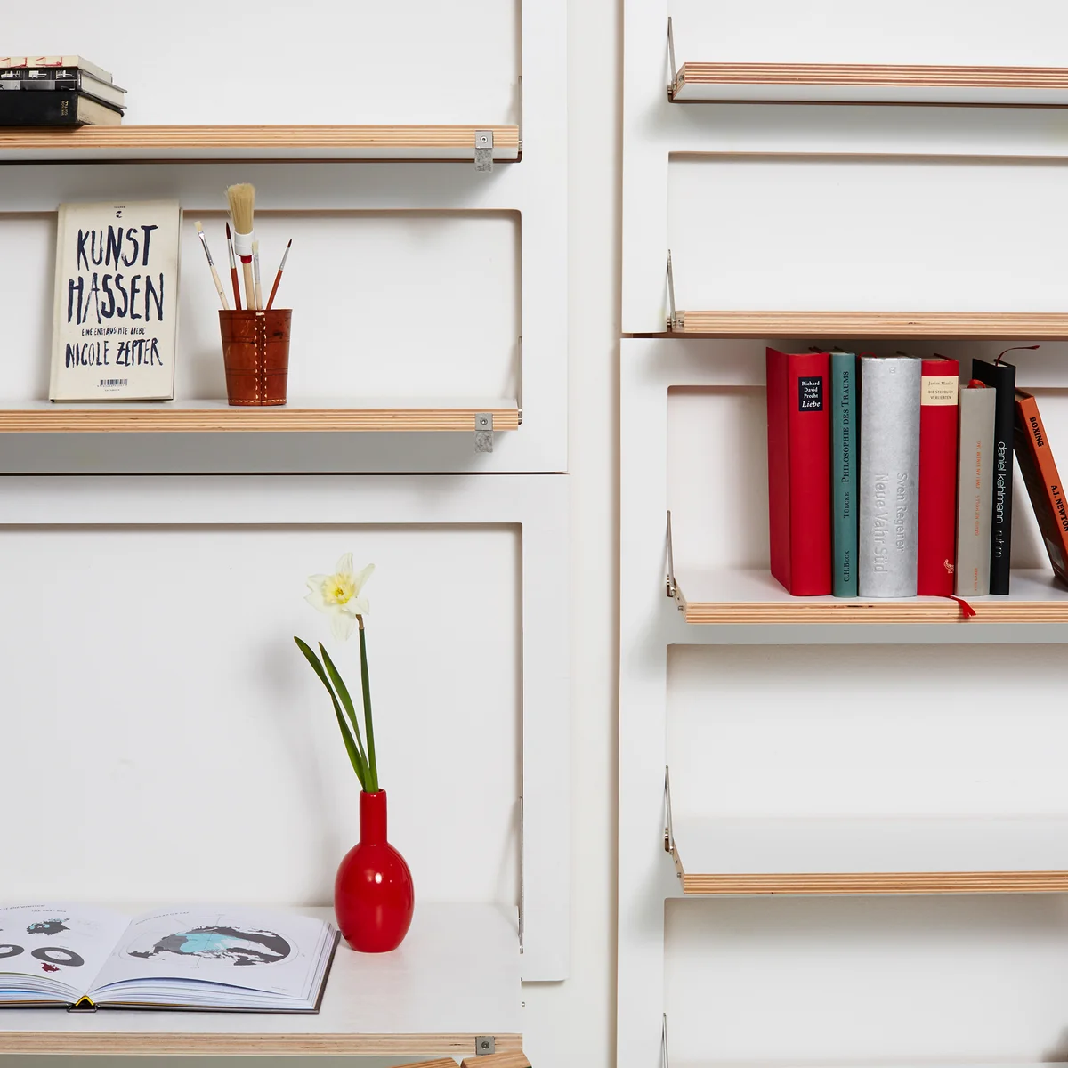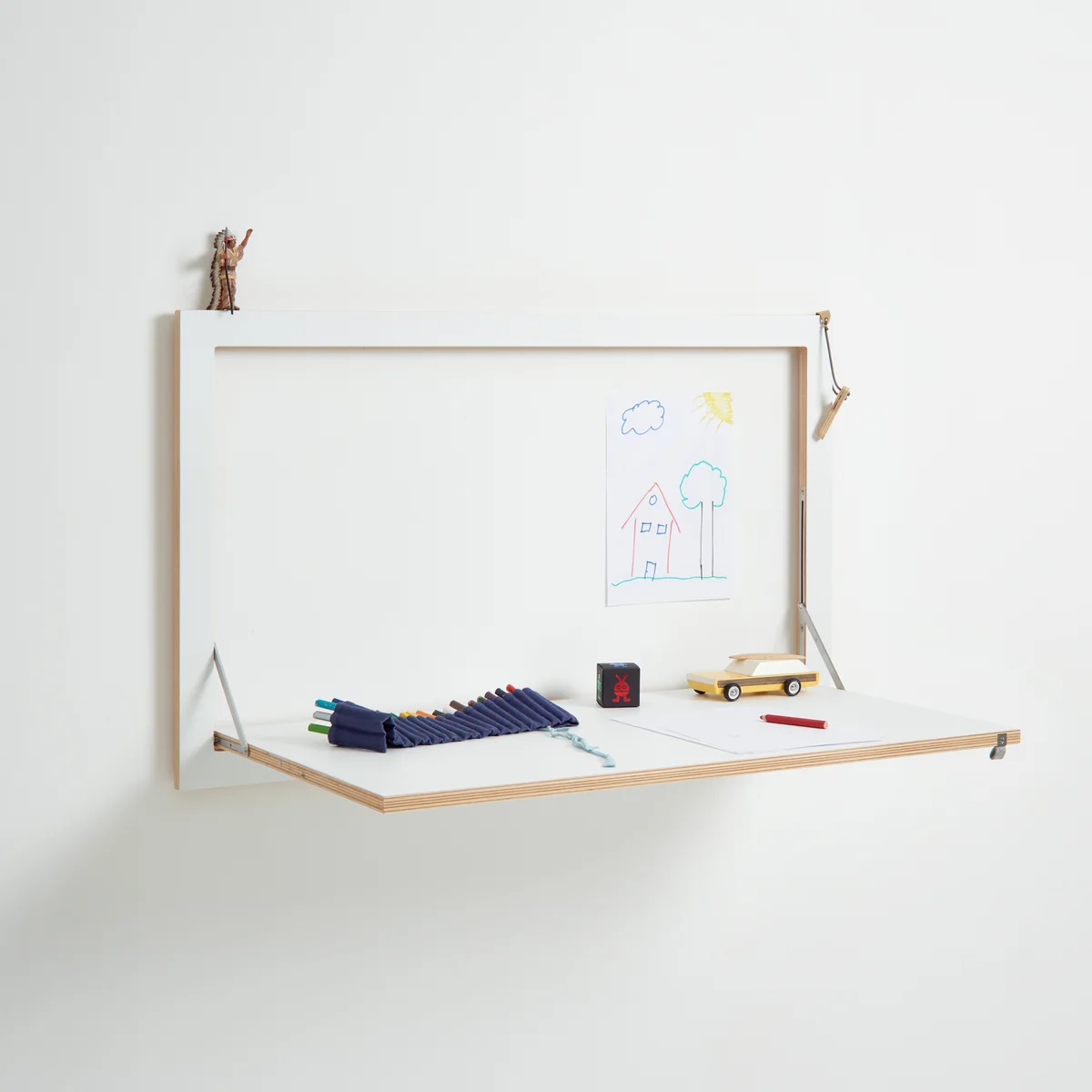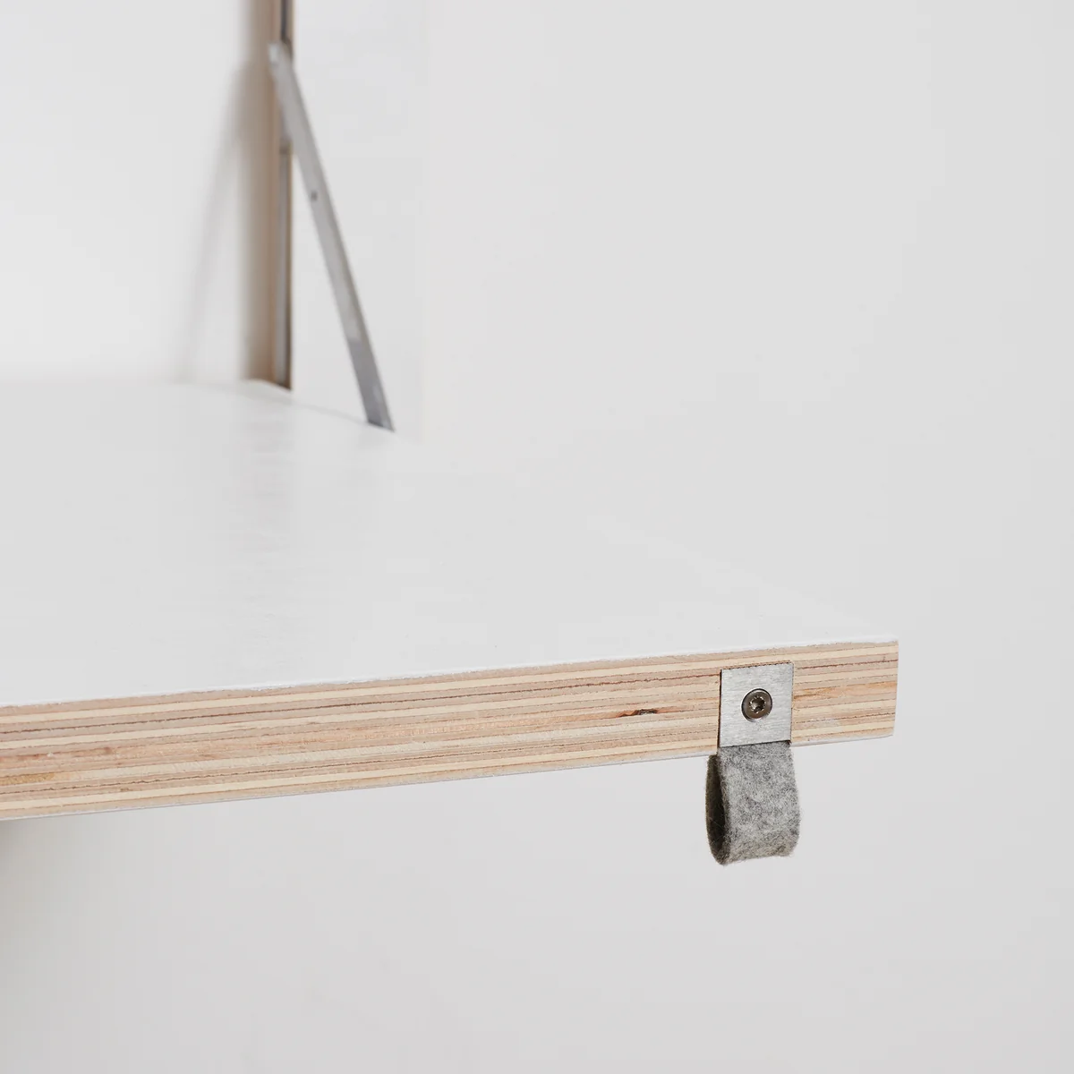 The wall-mounted secretary is made of FSC®-certified birch plywood, while the folding functions are made of stainless steel. A small felt loop makes it easier to fold out the work surface. The surfaces are lacquered by hand and are available in various colors and motifs. In white, for example, the secretary desk blends in with the wall of the same color, while a secretary desk with a motif becomes a decorative picture on the wall when folded up.