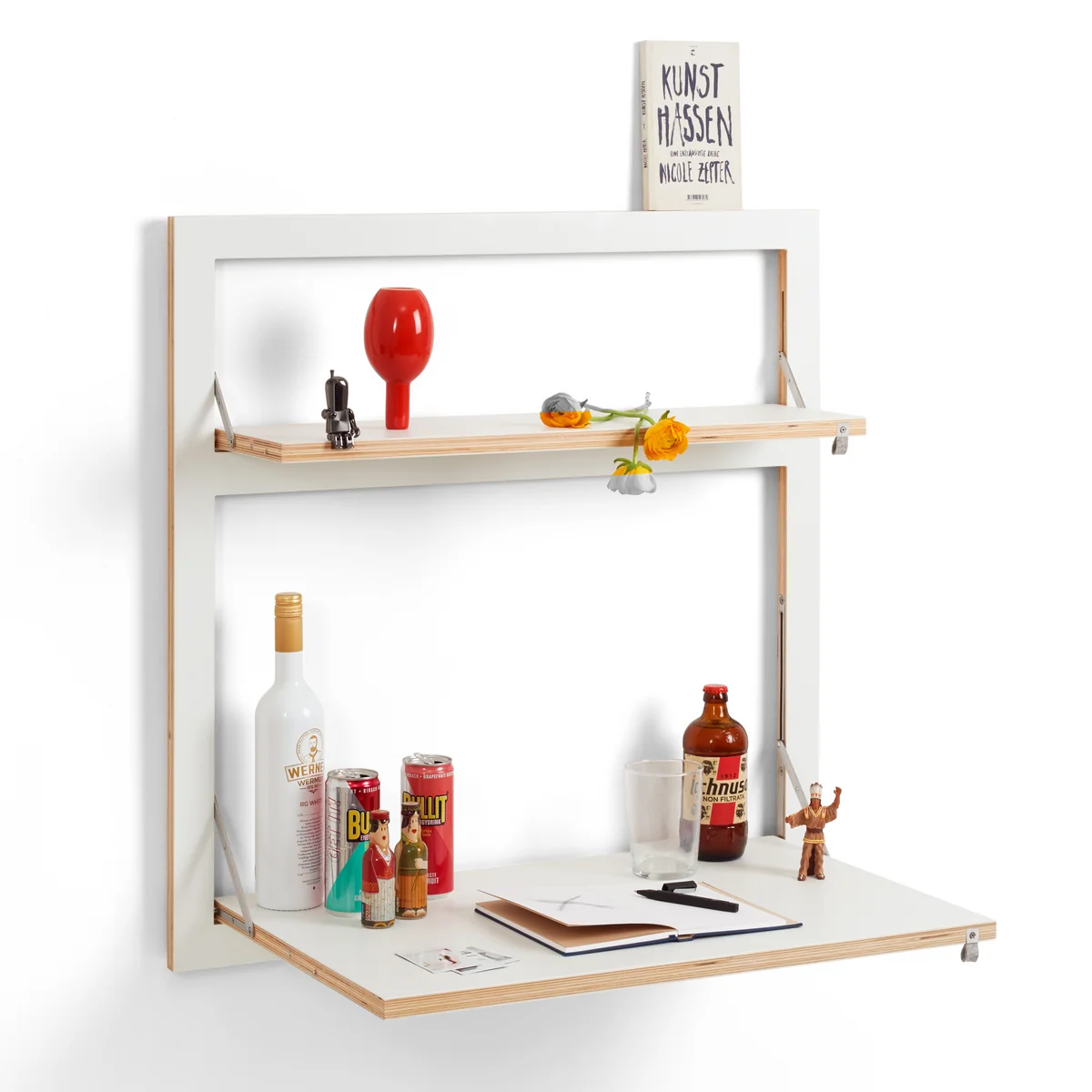 Fläpps Sekretär/in from Ambivalenz is a functional and space-saving wall-mounted secretary that folds out. Mounted at any height and therefore suitable for sitting or standing, the wall-mounted secretary impresses with its extremely shallow depth of just 3 cm when folded down. When unfolded, the secretary becomes a true multifunctional talent. Fläpps The secretary can be used as a desk, dining table, craft table and much more.