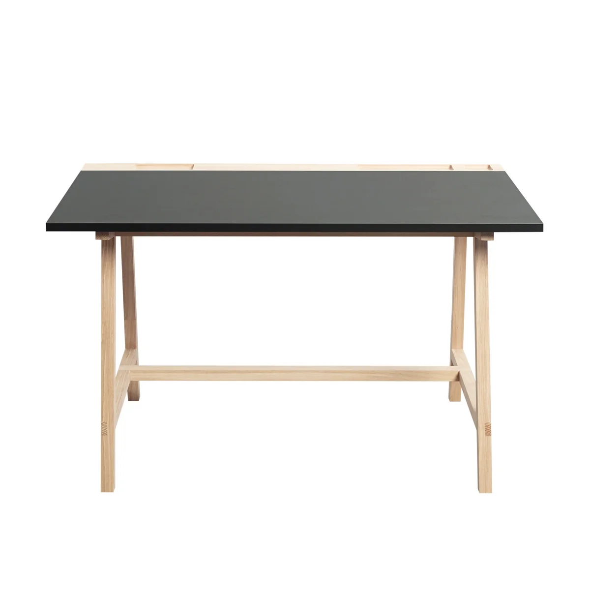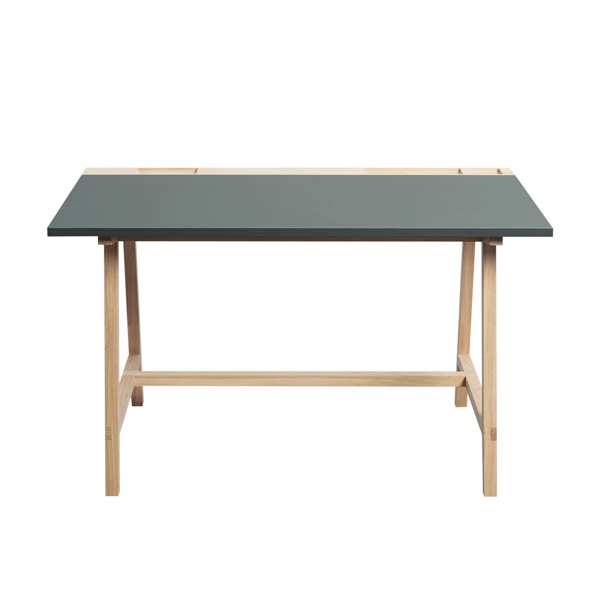 The frame is made from solid oak and requires only minimal care. The large table top is made from durable linoleum sheeting, coming in various colours. The trays at the back of the plate are especially handy. In different-sized notches keep paper clips, pencils, ruler, scissors and paper for you at hand.