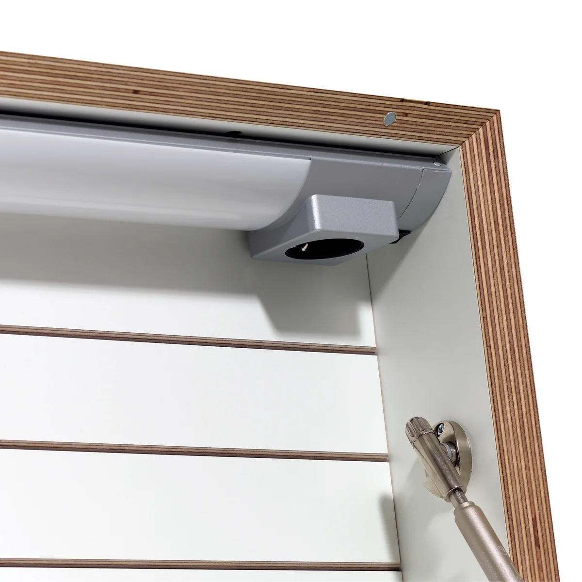 The secretary has a large, stable worktop measuring 420x710 mm. The high-quality flap holders guarantee slow, damped lowering of the worktop. The inner functional area of the furniture has a depth of 85 mm. Behind a removable panel there is a non-glare workplace lighting with an integrated socket.