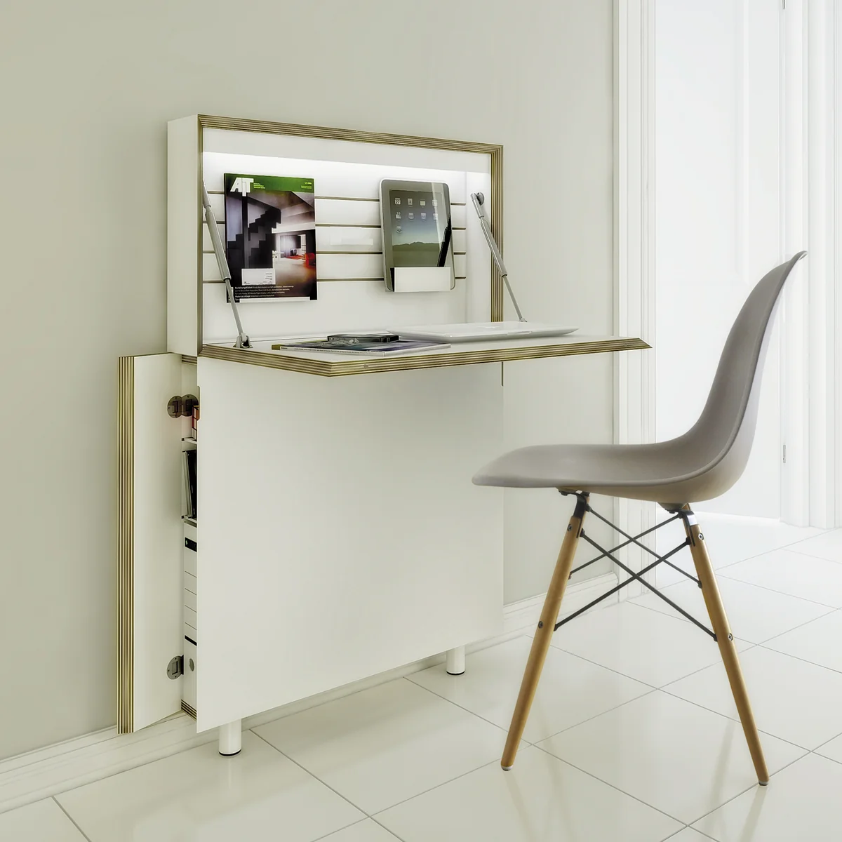 The Flatmate secretary of the Müller Small Living is probably the smallest fully equipped secretary on the market. With its minimalist design and shallow depth, it can fit in even the smallest Flatmate even in the smallest space and offers storage space, shelf as well as writing surface.