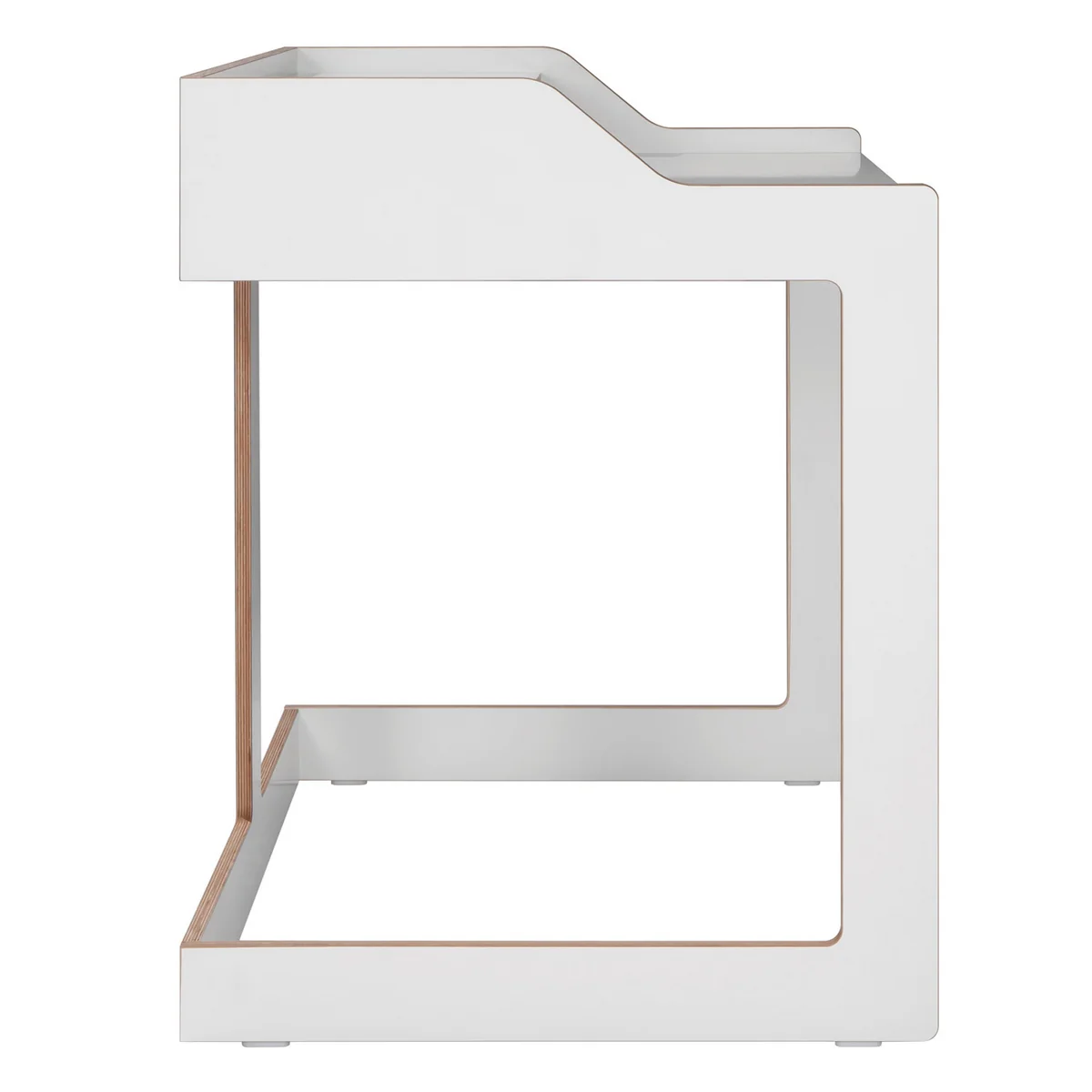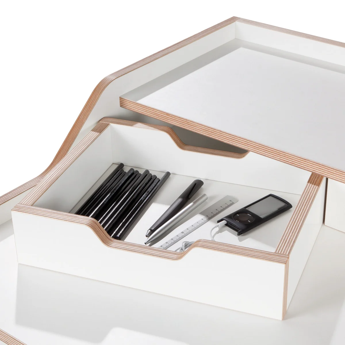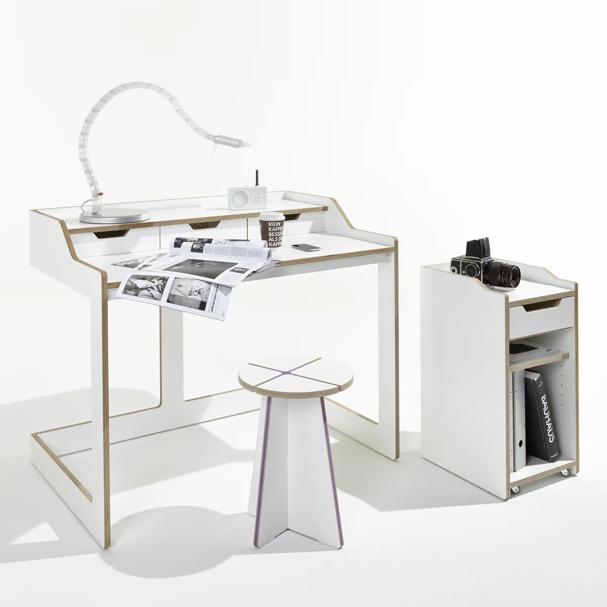 The desk is made out of birch multiplex boards and covered with melamine. The surfaces are lacquered white. The edges are untreated and oiled. This creates the pleasant contrast of colours of the Plane Desk by Müller Small Living.