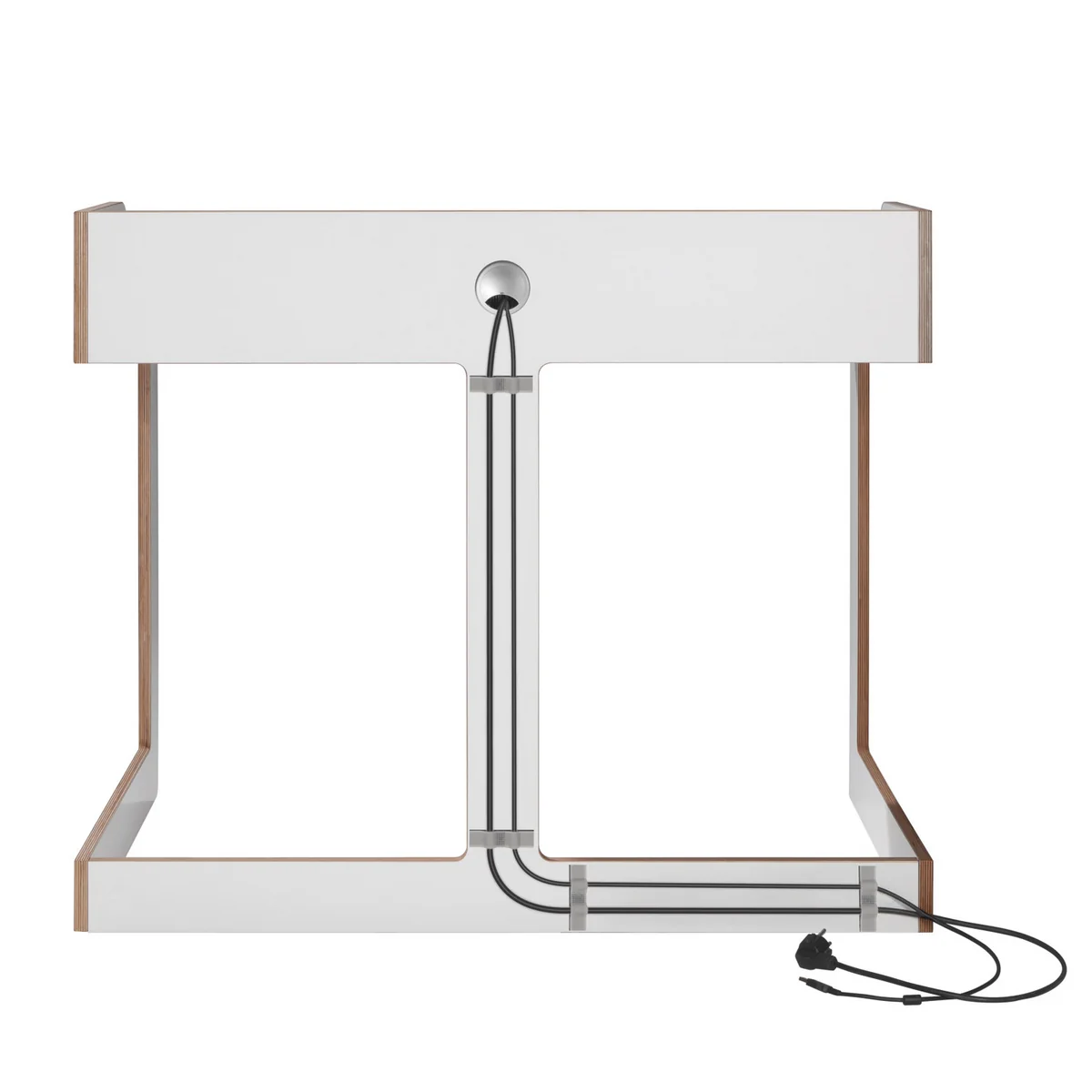The Felix Stark desk is equipped with two drawers that are hidden under a covering board. Between the drawers there is a third compartment that serves to hide cables. There are cable outlet holes on the back of the desk as well as in the table top. A thin board at the back of the desk further conceals the cables that lead to a power source.