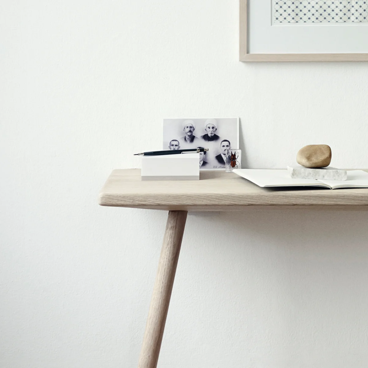 The Georg Desk from Danish manufacturer Skagerak was reduced to the bare essentials by designer Christina Liljenberg Halstrøm. With two round legs and rounded edges, the table is made entirely of solid oak wood. The narrow workstation is designed to lean against the wall and does not require screws or assembly to do so. The leaning furniture thus offers a space-saving surface for the living room, hallway or in the bedroom - depending on where the practical worktop is needed. The desk is also available with four legs.