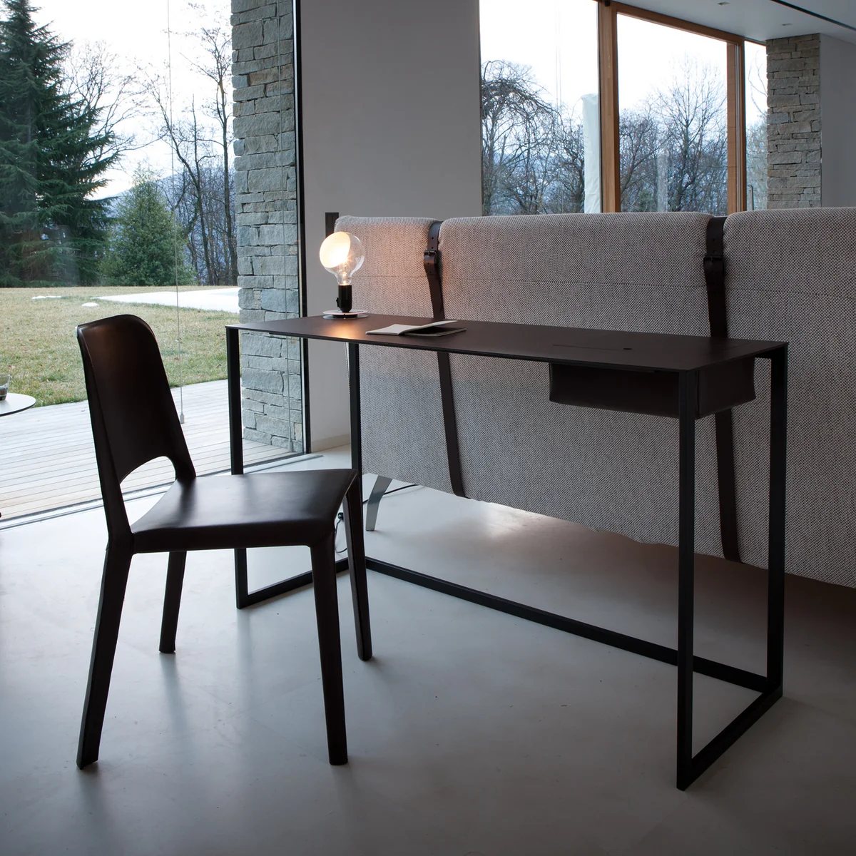 The Calamo table was designed by Gabriele Rosa in 2013. In order to focus on this specialty, the desk’s shape is reduced and clear: The surface of leather should be emphasized. Bend leather is a thick (min. 2,5 mm), herbal tanned and only moderately fattened calfskin, which keeps its natural, anarchic appeal by means of the material thickness.