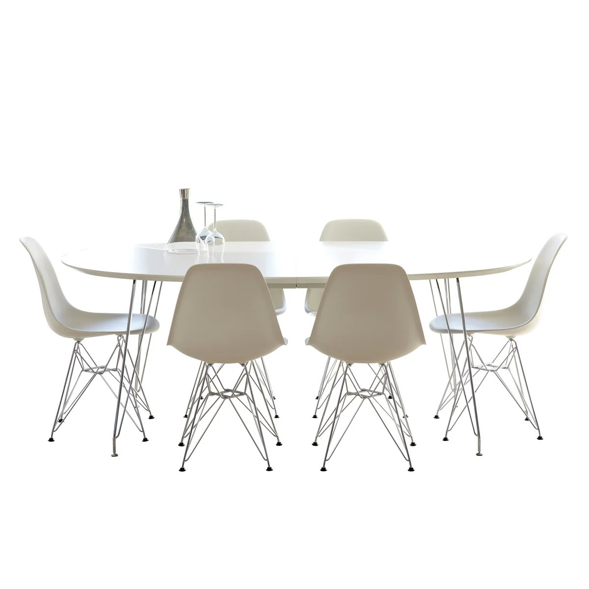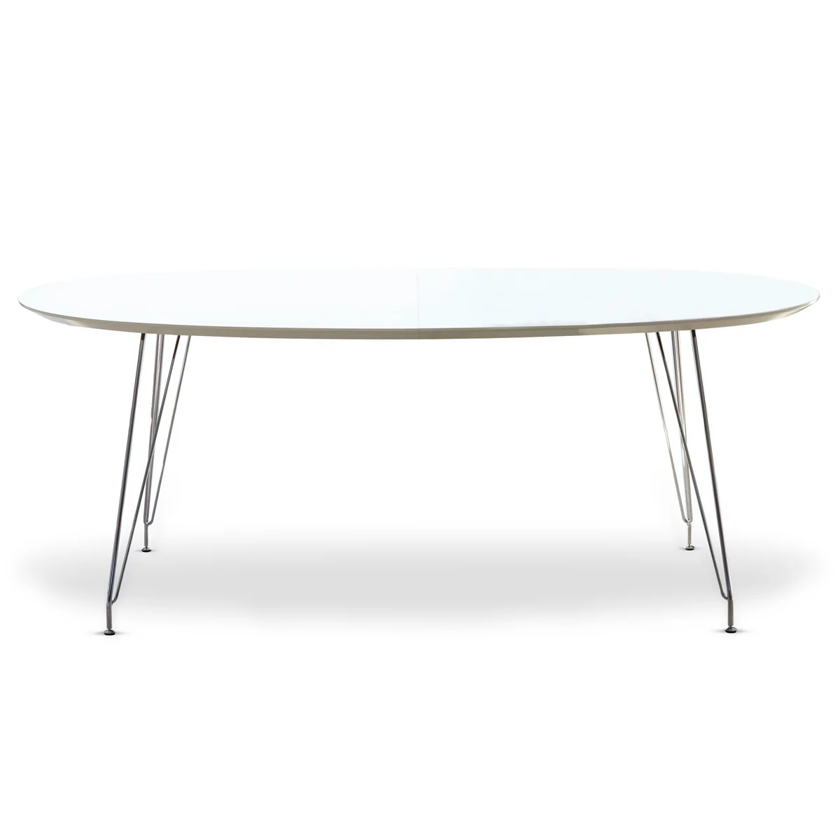 The table top is oval shaped and can be extended as desired with up to three plates (not included). Thus, the dining table can be extended in 50 cm steps up to 1.5 meters.