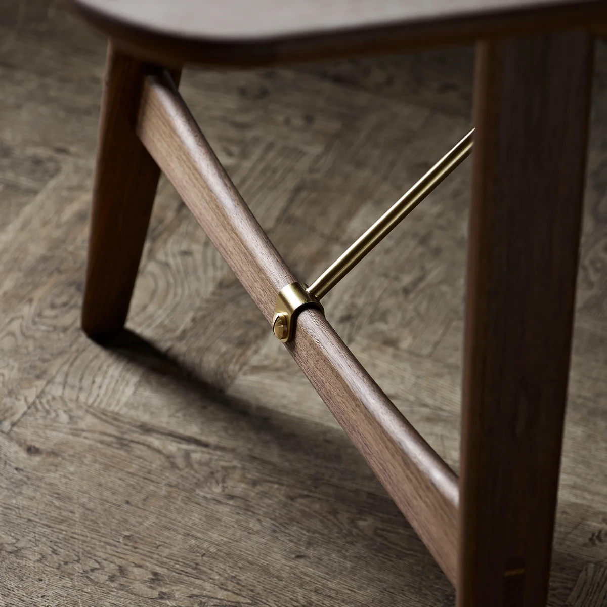 The clearly visible grain of the solid wood adds a natural touch to the environment. The rounded edges and tapered legs with soft contours enhance this organic look. The metal diagonal struts provide a contrast as well as introducing an industrial element to the piece and, as a result, creates an exciting ensemble.