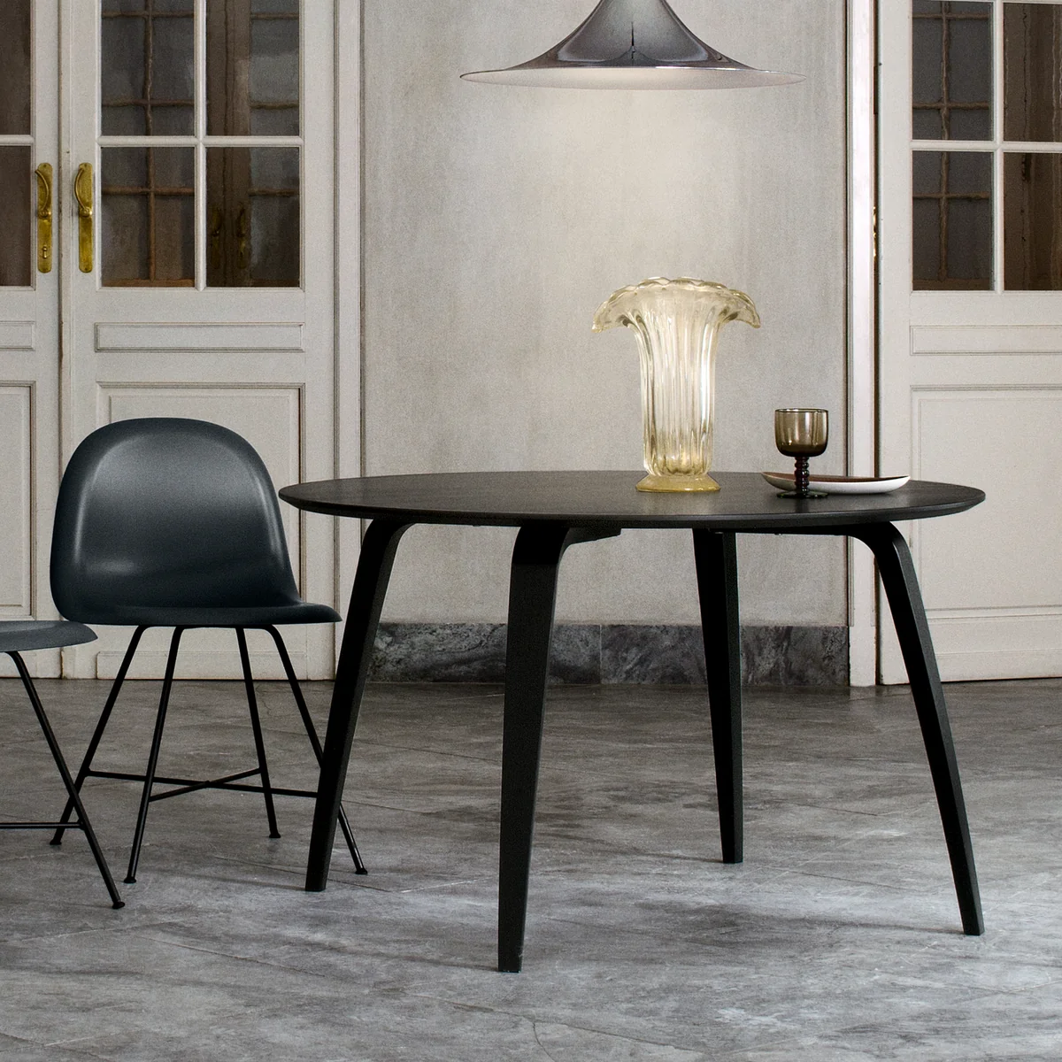 The dining table from Komplot Design for Gubi is particularly versatile with its round table top and slender legs. With a table top made of wood or laminate, the table impresses with different looks.
