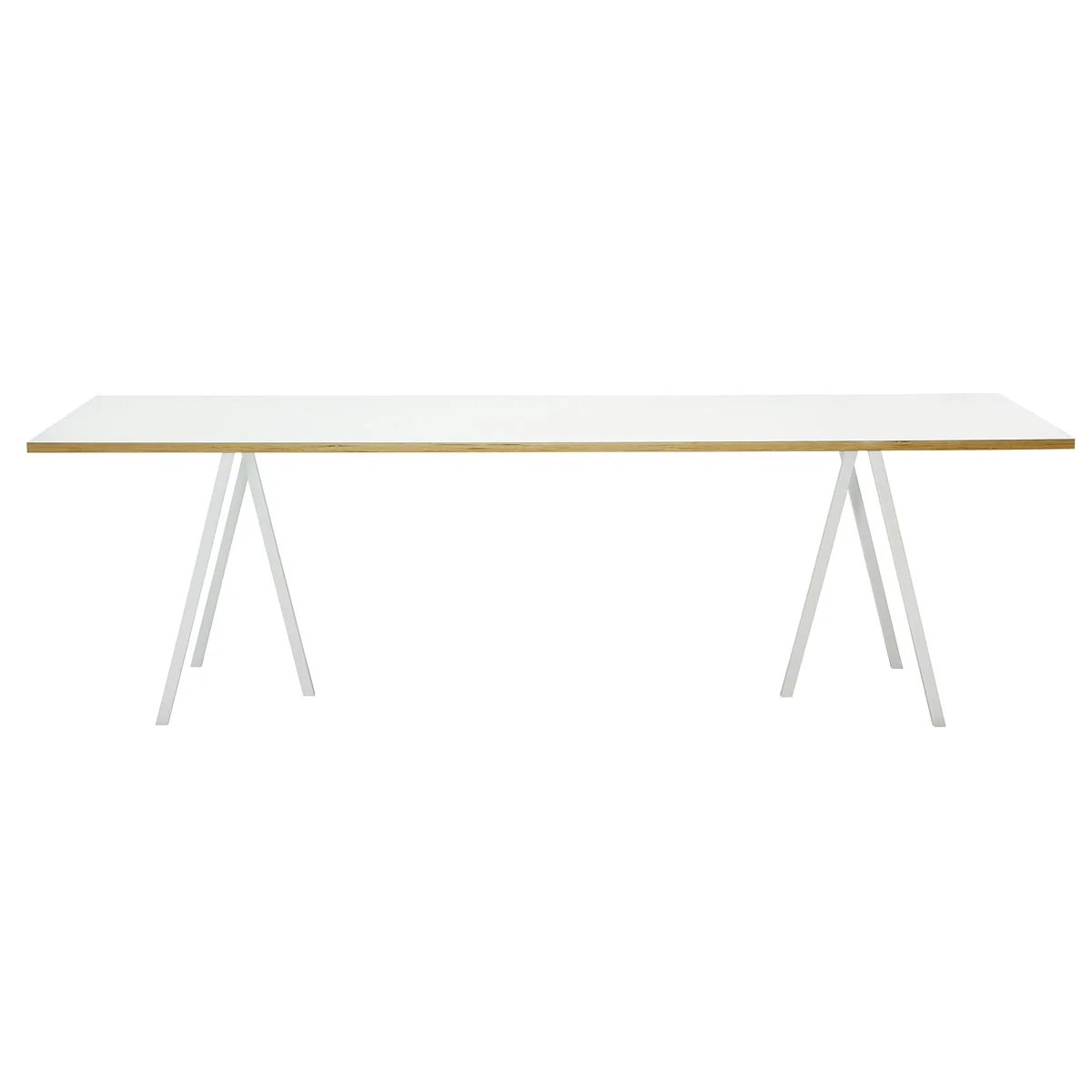 The Loop Stand able comes across as very down-to-earth too. Its smooth surface is complemented with clear edges. With the black version, the tabletop (linoleum) and edges (ash) are painted in the same colour, which makes the six-legged table appear elegant and chic. In white, the edges of the tabletop (laminate) are left in a natural wooden colour (plywood), giving Loop a classic Scandinavian holiday cottage appearance. The legs are made of lacquered, powder-coated steel.