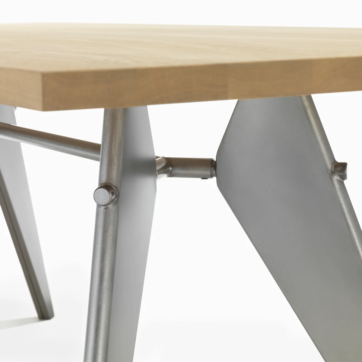 The diagonally attached, tapering legs give the EM Table a constructive dynamism and strength. A crossbar of round tubing connects the legs to create stability. The wooden tabletop contrasts the metal and makes the table look lighter. The table produced today by Vitra EM Table is emblematic of Jean Prouvé's design philosophy, which thrives on the combination of architecture, technology and craftsmanship.