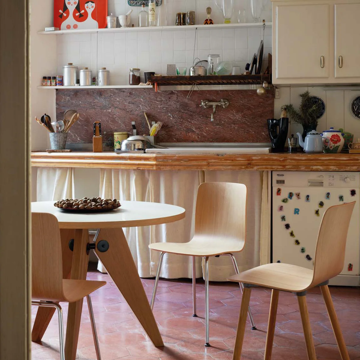 In order to achieve this impression, Prouvé varies his typical, architecturally shaped design language with natural materials. Originally born out of the metal shortage of the Second World War, the wooden construction of the Guéridon was convincing even after the war. This is how the Frenchman designed the dining table in 1949, which is based on the coffee table of the same name designed in 1944.