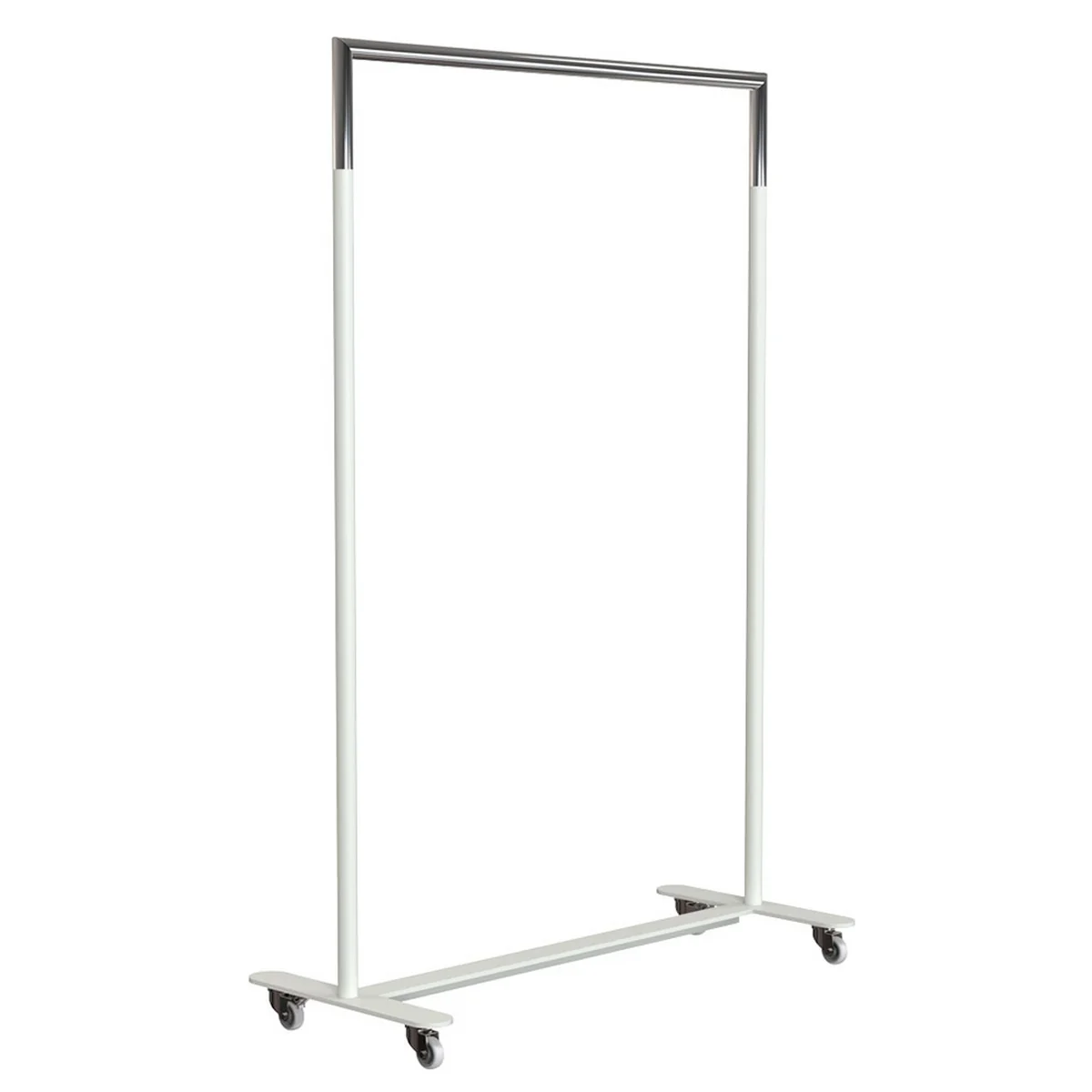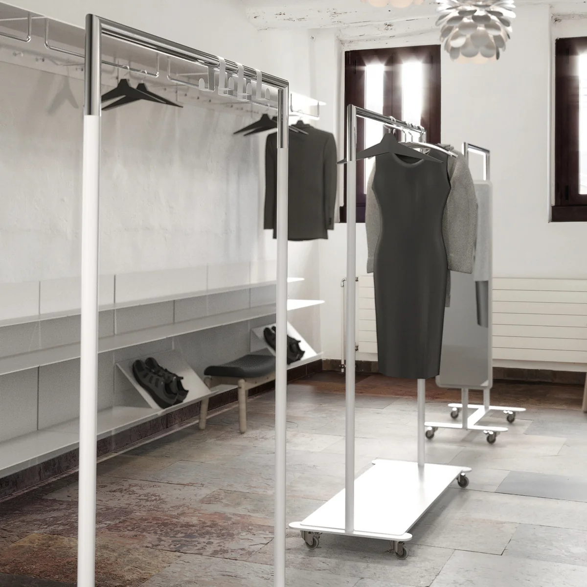 Thanks to the Bukto clothes rack by Bønnelycke for Frost, your favourite clothes can be stylishly displayed. The clothes rail designed by Bønnelycke has an elegant design with straight lines and defined edges, but is so minimalist that it does not steal the show from the clothes. Blouses, trousers and sweaters can find their place in the bedroom and are immediately visible on the bar. When kept in the hallway, the piece becomes a coatrack on which to hang up coats and jackets. The practical castors give the clothes rail a mobile quality that makes it possible to move it to the desired location.