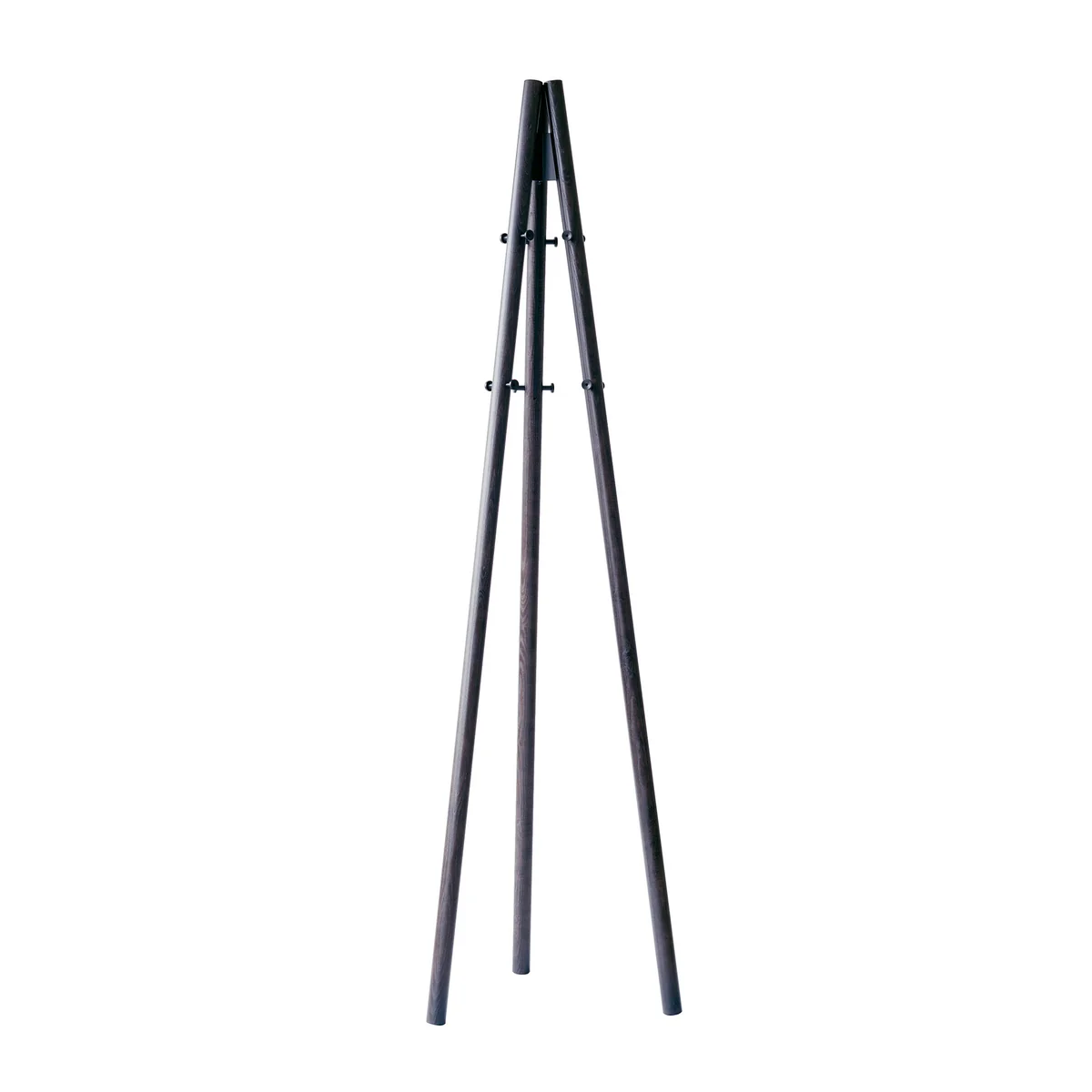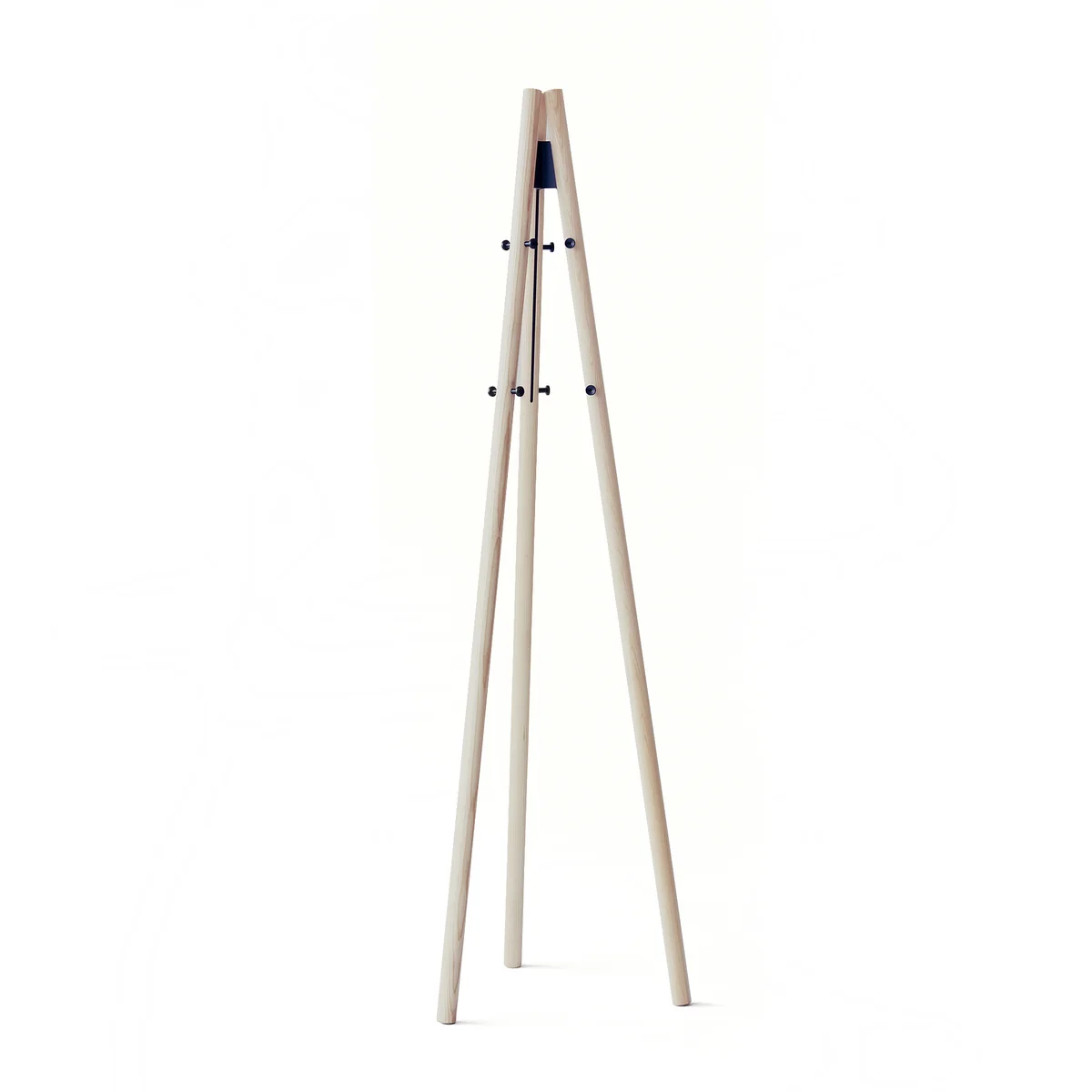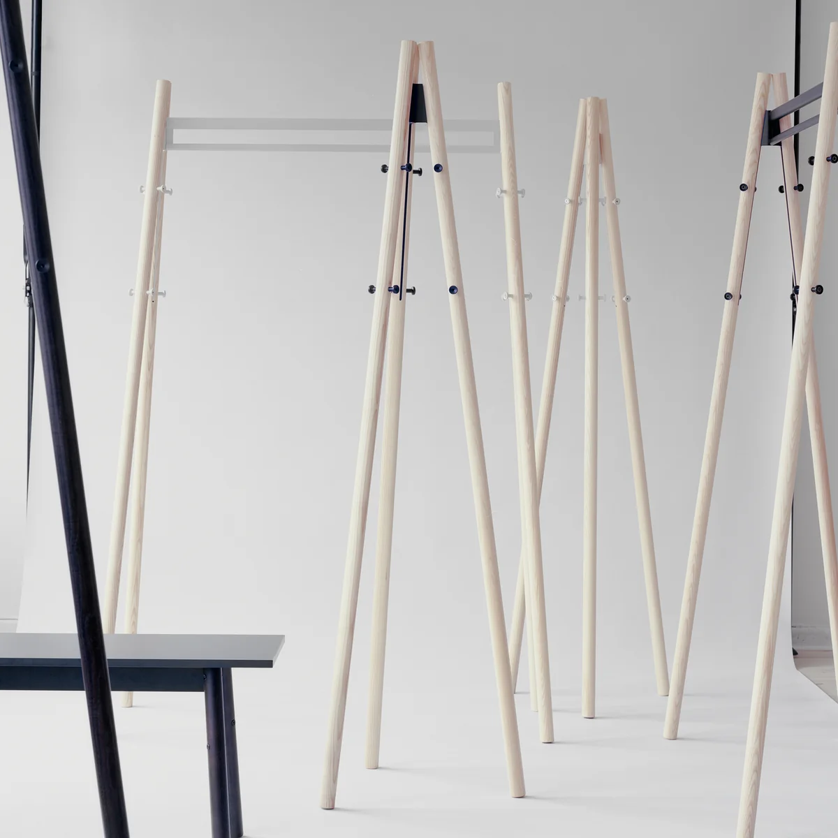 The construction resembles a tripod and consists of a wedge-shaped, powder-coated metal joint on which three slim ash wood legs are mounted. They are screwed together with metal pins which protrude slightly and thus also serve as coat hooks. Rybakken has deliberately made all elements of the construction visible, creating a transparent design that keeps nothing hidden from the user. Rybakken's work can be understood as a homage to the famous Finnish designer Alvar Aalto and the often recognisable originality in his designs.