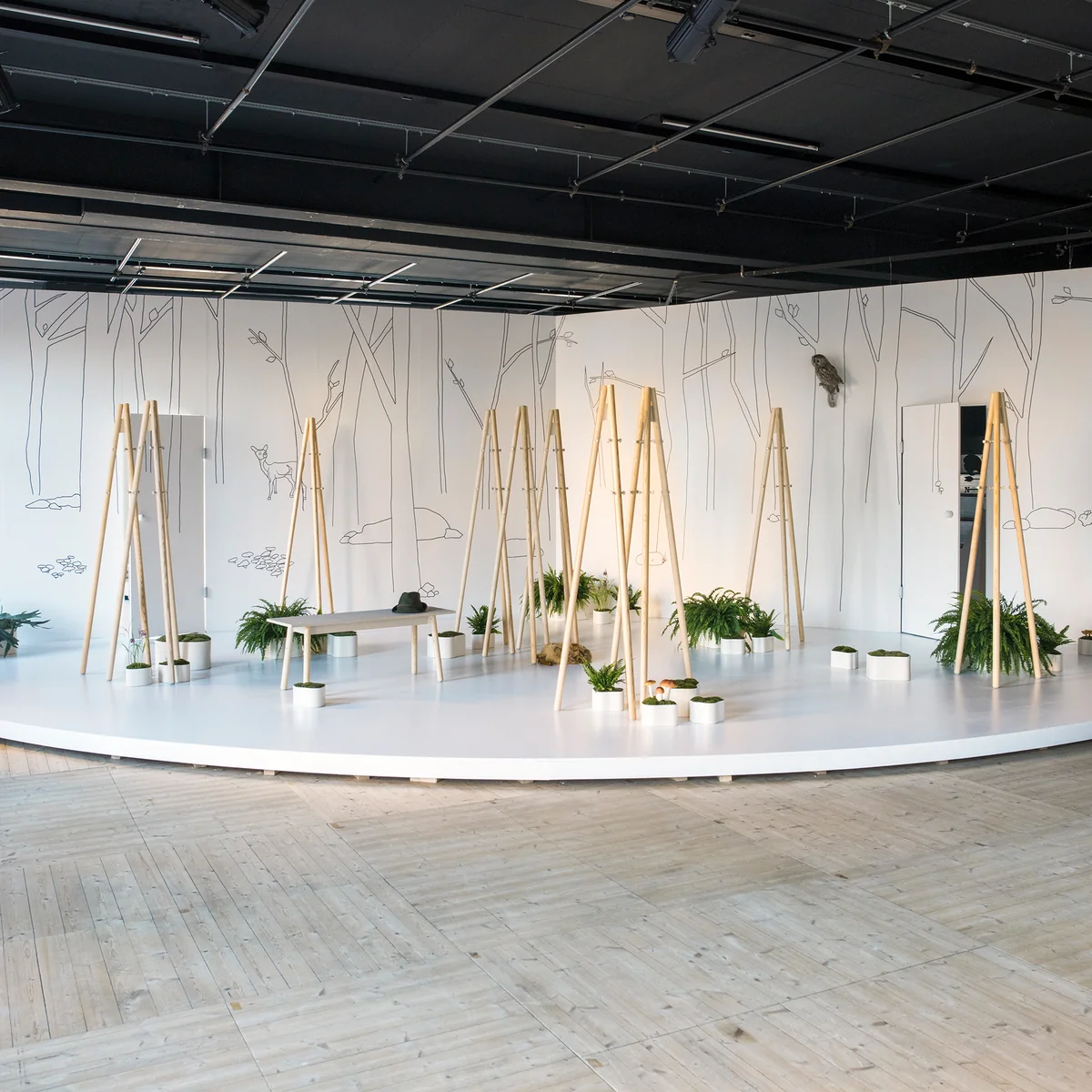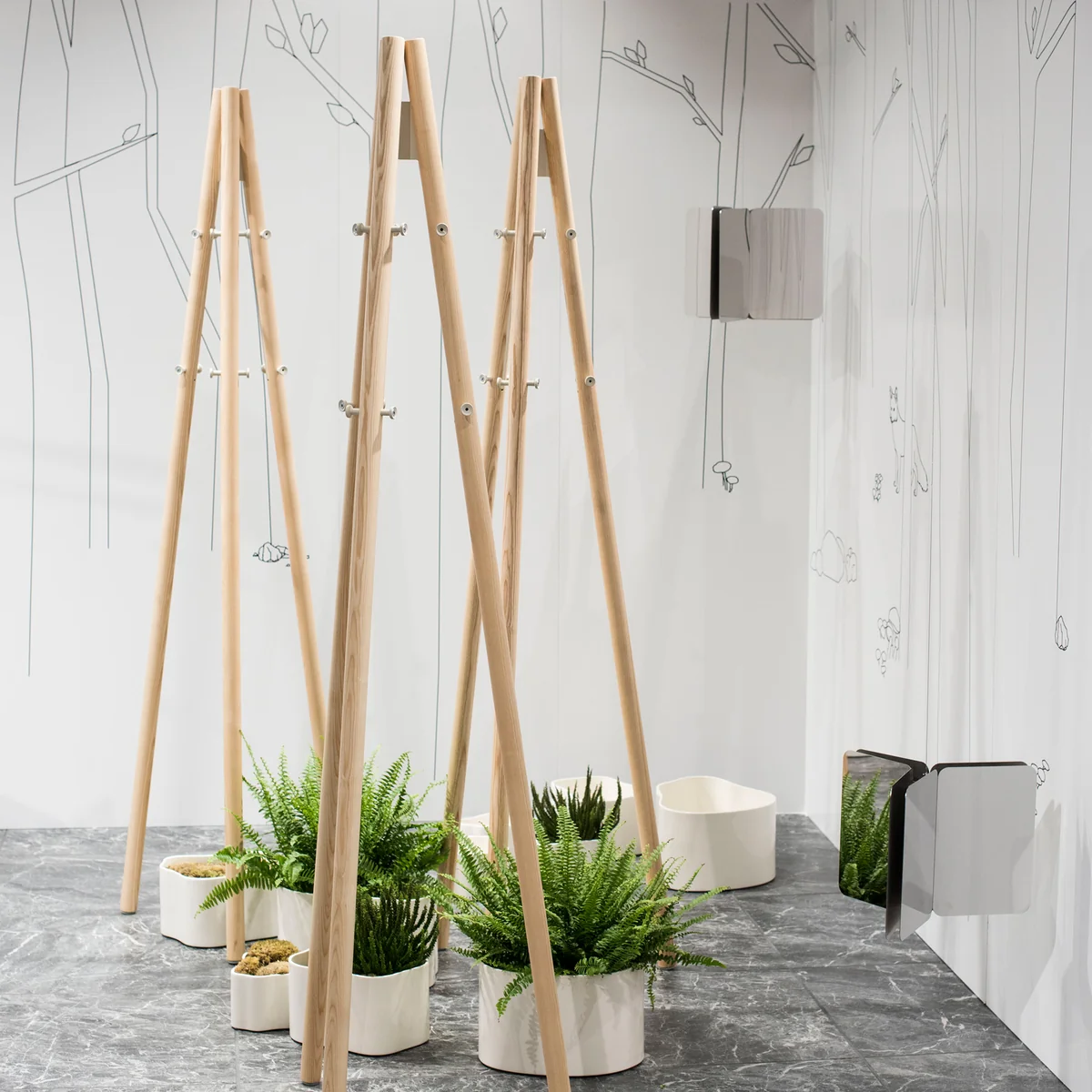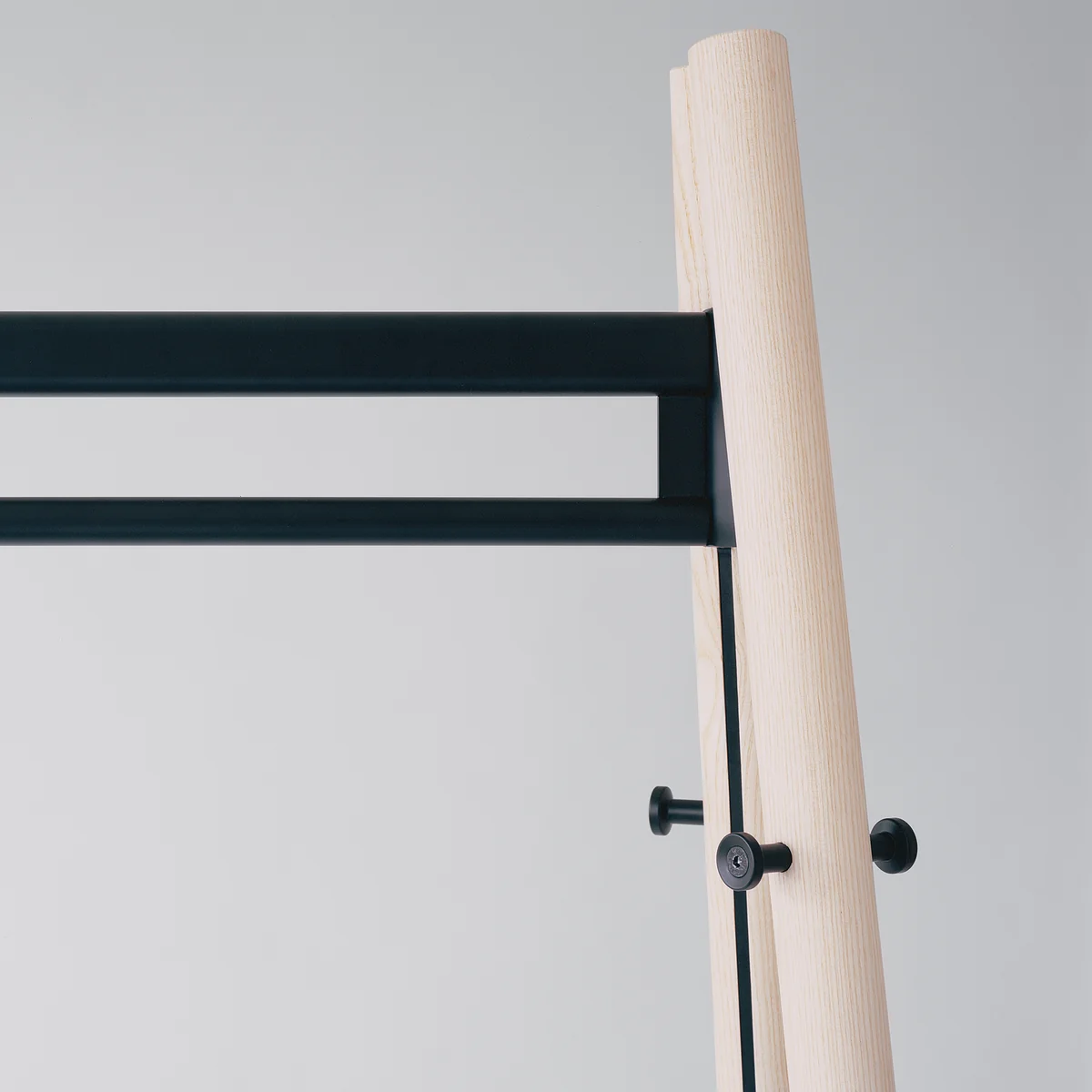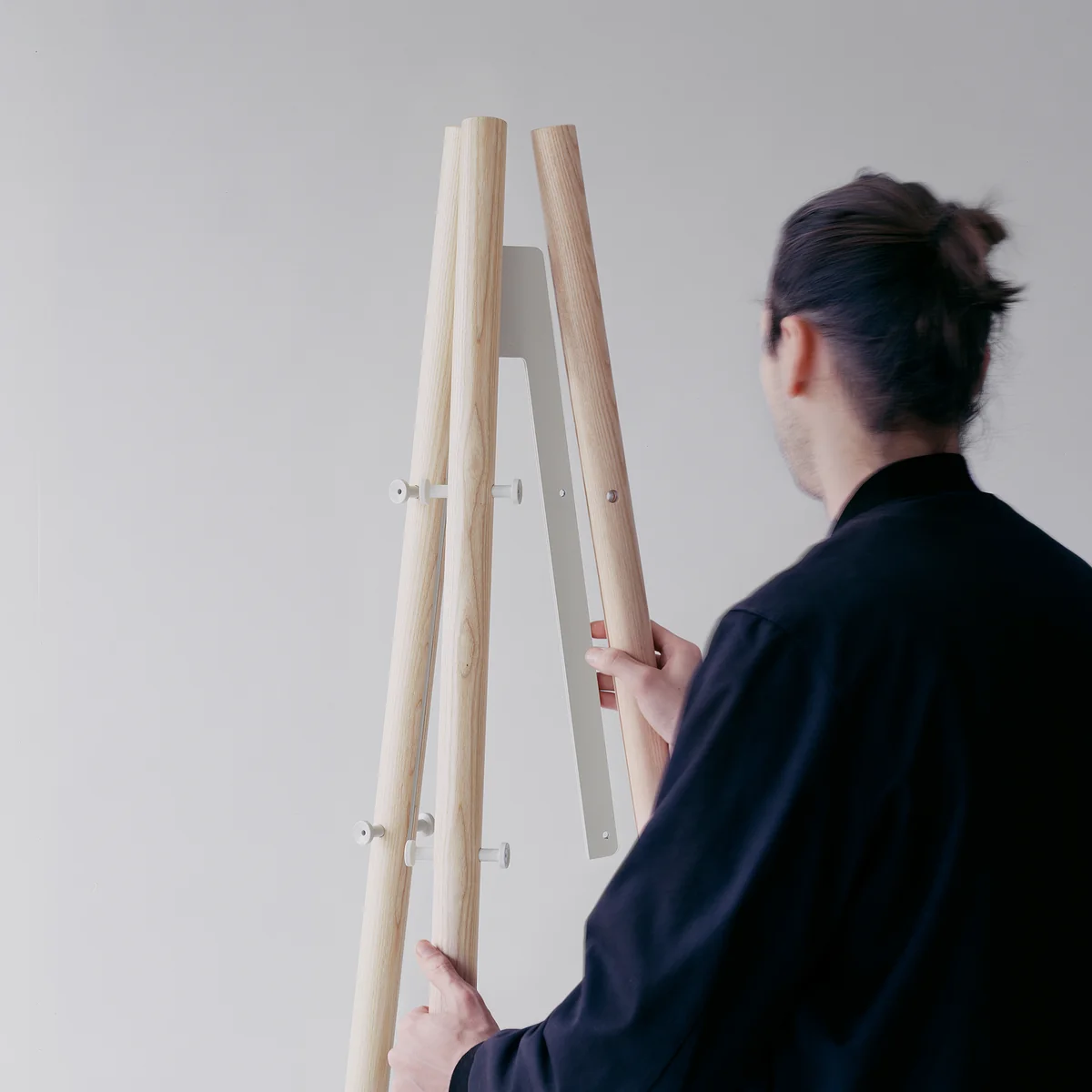 The construction resembles a tripod and consists of a wedge-shaped, powder-coated metal joint on which three slim ash wood legs are mounted. They are screwed together with metal pins which protrude slightly and thus also serve as coat hooks. Rybakken has deliberately made all elements of the construction visible, creating a transparent design that keeps nothing hidden from the user. Rybakken's work can be understood as a homage to the famous Finnish designer Alvar Aalto and the often recognisable originality in his designs.