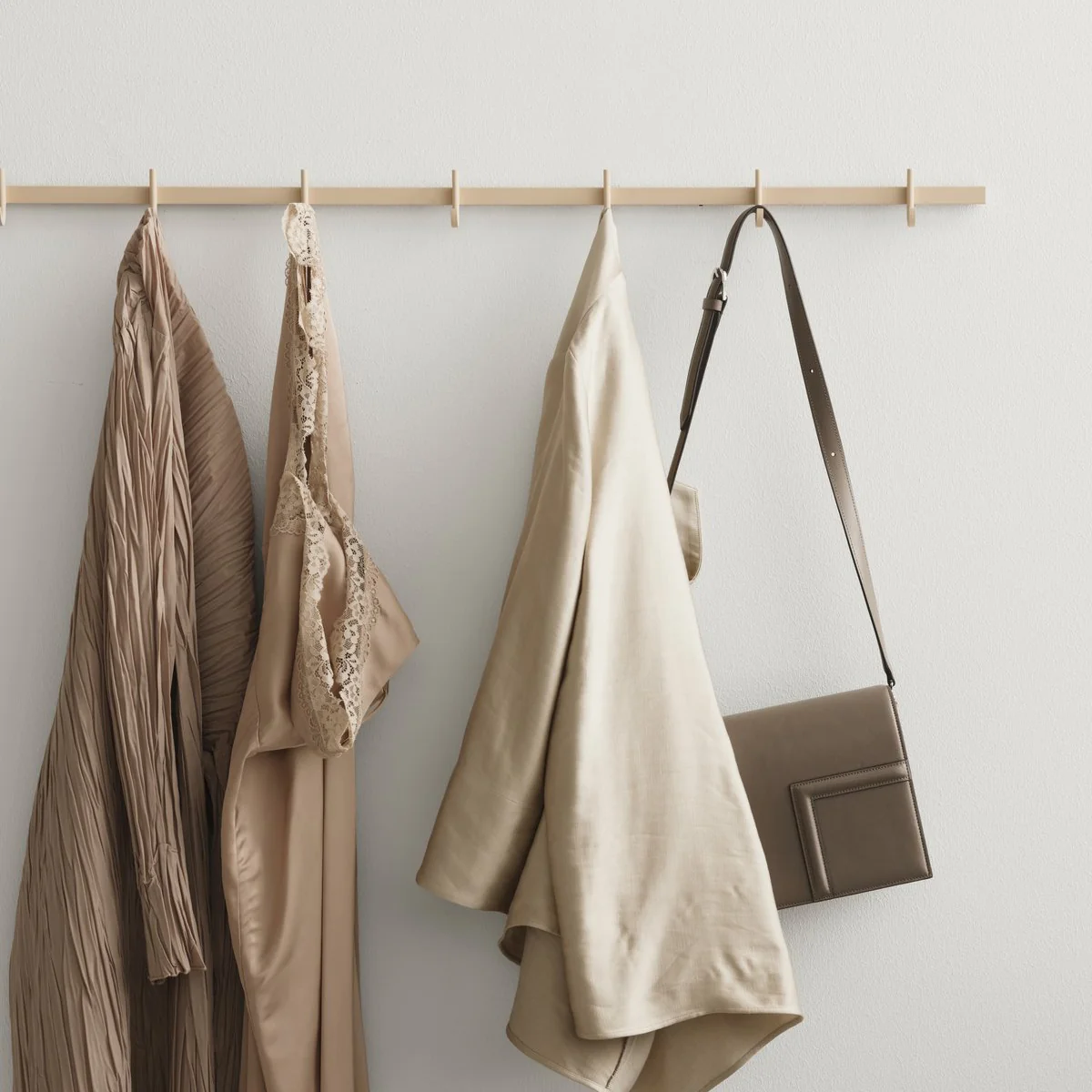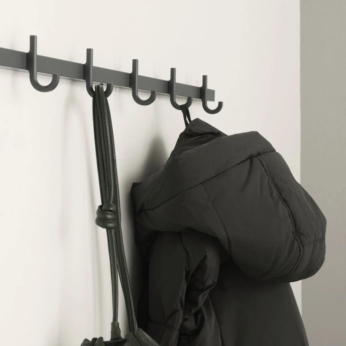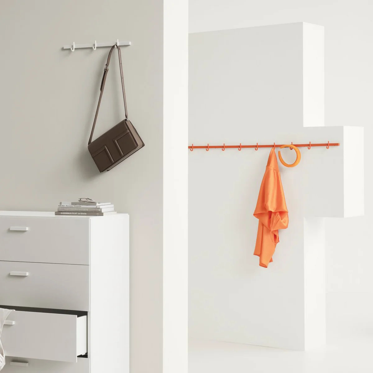 The Relief hook rail from String is not only a practical wall coat rack, but also an aesthetic highlight for any entrance area or hallway. Made of high-quality, powder-coated aluminum, it impresses with its clear design and robust construction. The relief structure gives the hook rail a special touch and makes it an eye-catcher on the wall. With its multiple hooks, it offers sufficient space for jackets, scarves, handbags and other accessories, while at the same time creating order and clarity. Thanks to its timeless design, the hook rail blends harmoniously into a wide variety of interior styles and adds a touch of Scandinavian elegance to any room.
