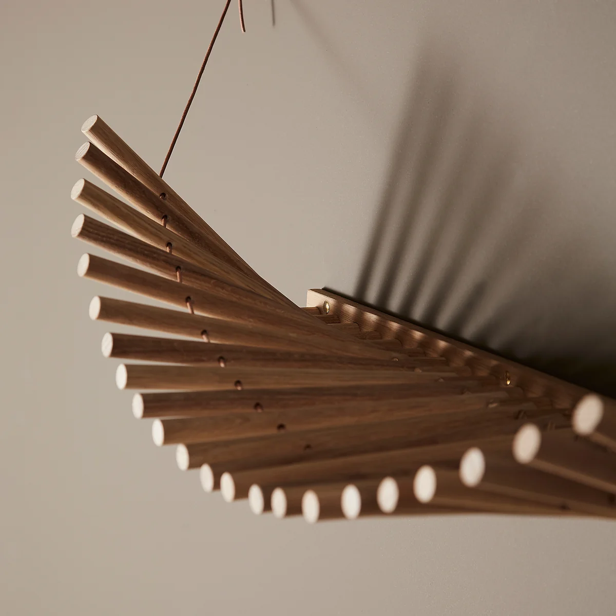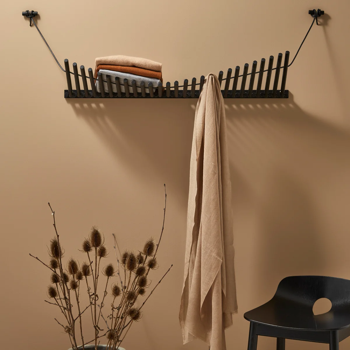 The Knaegt wall mounted wardrobe from Woud convinces with its elegant aesthetics. The simple repetition of wooden sticks with a continuous leather cord makes the wardrobe dynamic, as the line created by the sticks changes depending on what is hanging on the shelf. This gives the wardrobe a modern, lively character.