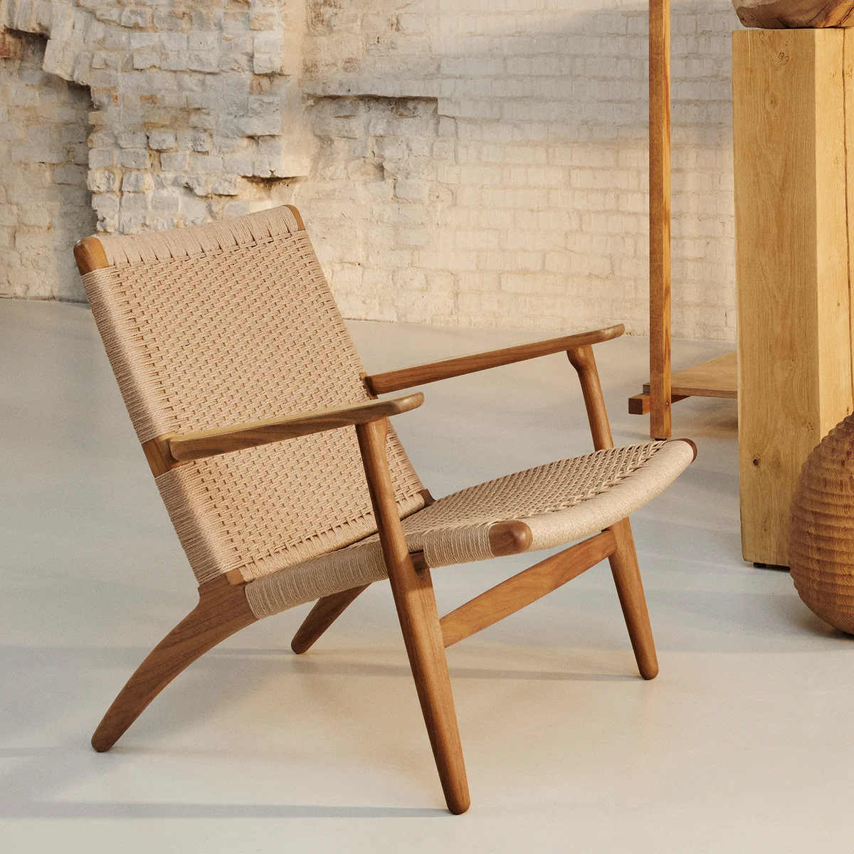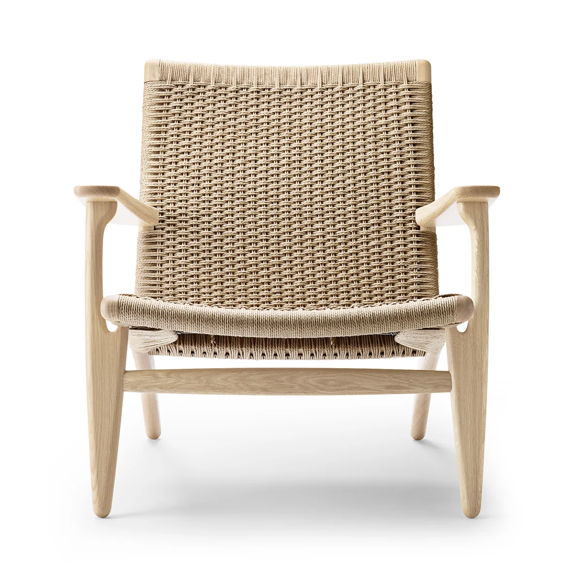The armchair with a low seat height of 35 cm consists of a frame made of oak wood or walnut in various finishes. Its inclined seat makes the armchair particularly comfortable. The back and seat are carefully hand-woven from paper yarn. Paper yarn is actually a wartime substitute material that proved to be particularly durable and versatile. When Wegner's chair was launched in 1950, its choice of material, only a few years after the end of World War II, was considered highly controversial and unheard of. Wegner, however, liked the look and durability of the material.