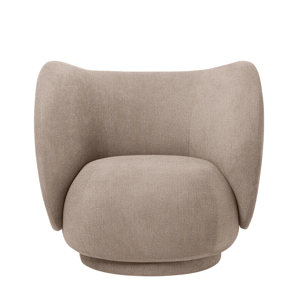 The Rico Lounge Chair from Ferm Living is characterized by its voluminous appearance, which is both cosy and inviting. Its curved backrest, which extends almost to the floor, seems to gently embrace the user and forms a harmonious connection with the seat. It is reminiscent of a classic round pouf and has no legs at all. With its compact expression and lush upholstery, the armchair invites you to relax.