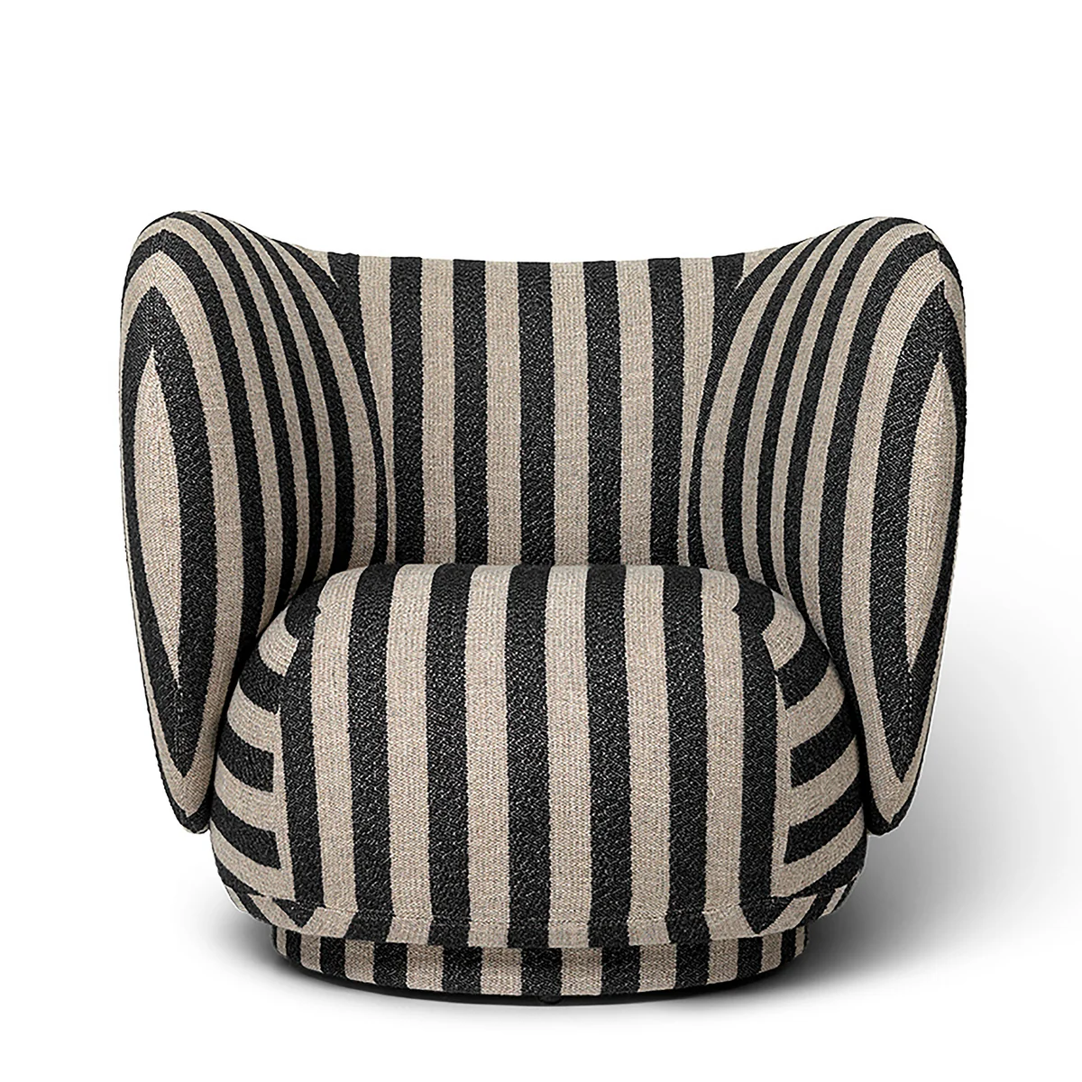 The Rico Lounge Chair from Ferm Living is characterized by its voluminous appearance, which is both cosy and inviting. Its curved backrest, which extends almost to the floor, seems to gently embrace the user and forms a harmonious connection with the seat. It is reminiscent of a classic round pouf and has no legs at all. With its compact expression and lush upholstery, the armchair invites you to relax.