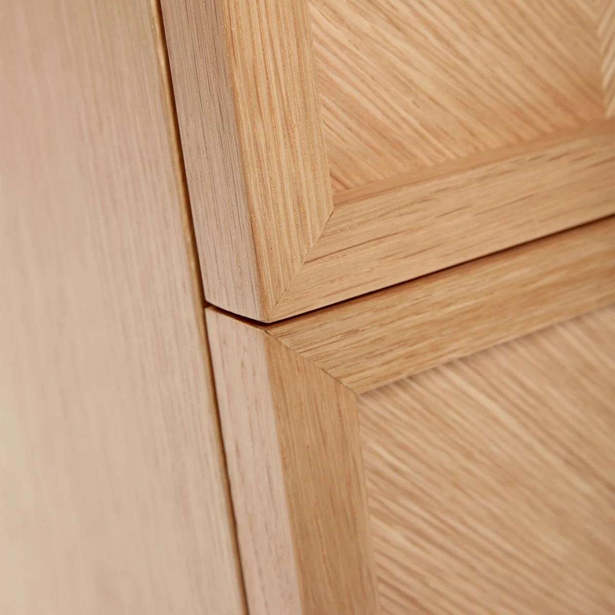 The Herringbone bedside cabinet impresses with its natural look and high-quality workmanship. Made from FSC®-certified oak wood, it brings long-lasting quality and a warm, timeless design to the bedroom. The striking herringbone structure provides a stylish accent, while the functional storage surface offers practical storage space next to the bed. An easy-care, robust piece of furniture that harmoniously complements any sleeping environment.