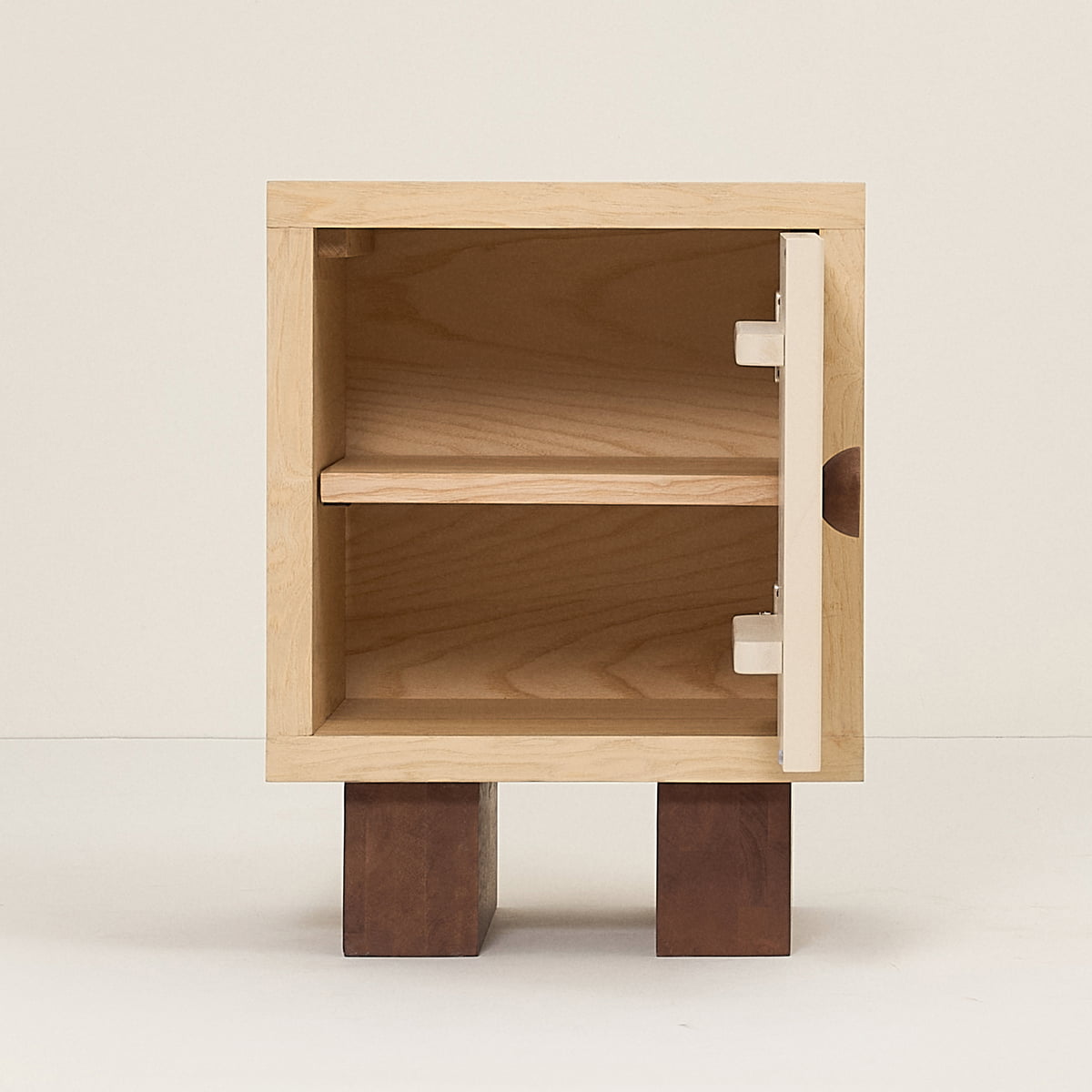 The grooved surface of the door invites children to playfully discover textures, while the rounded, high-contrast handle is not only easy to grip, but also safe and child-friendly. The legs of the bedside table, inspired by traditional Japanese geta sandals, give the piece of furniture a light, floating character.