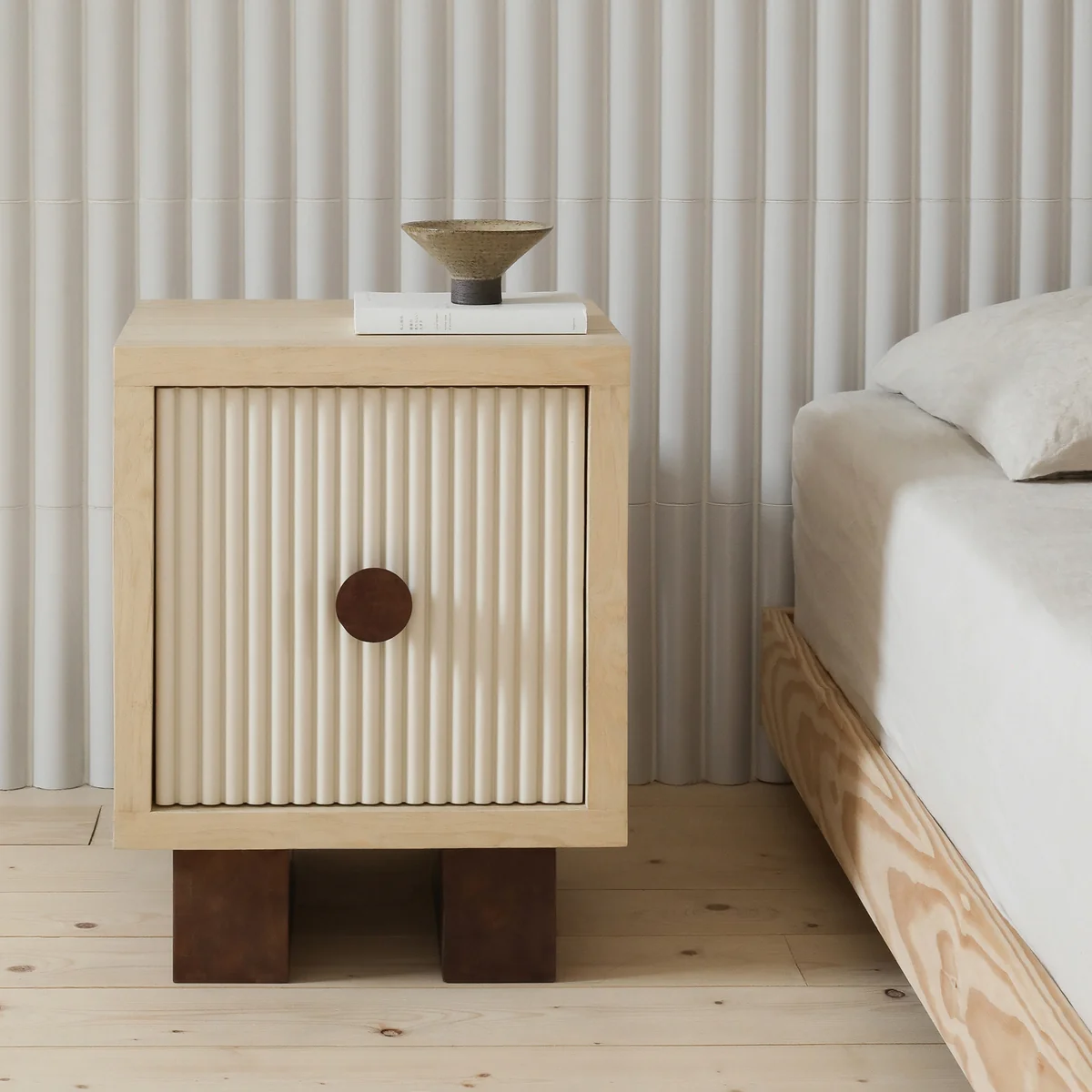 Bedside table in clear lines with soft contrasts