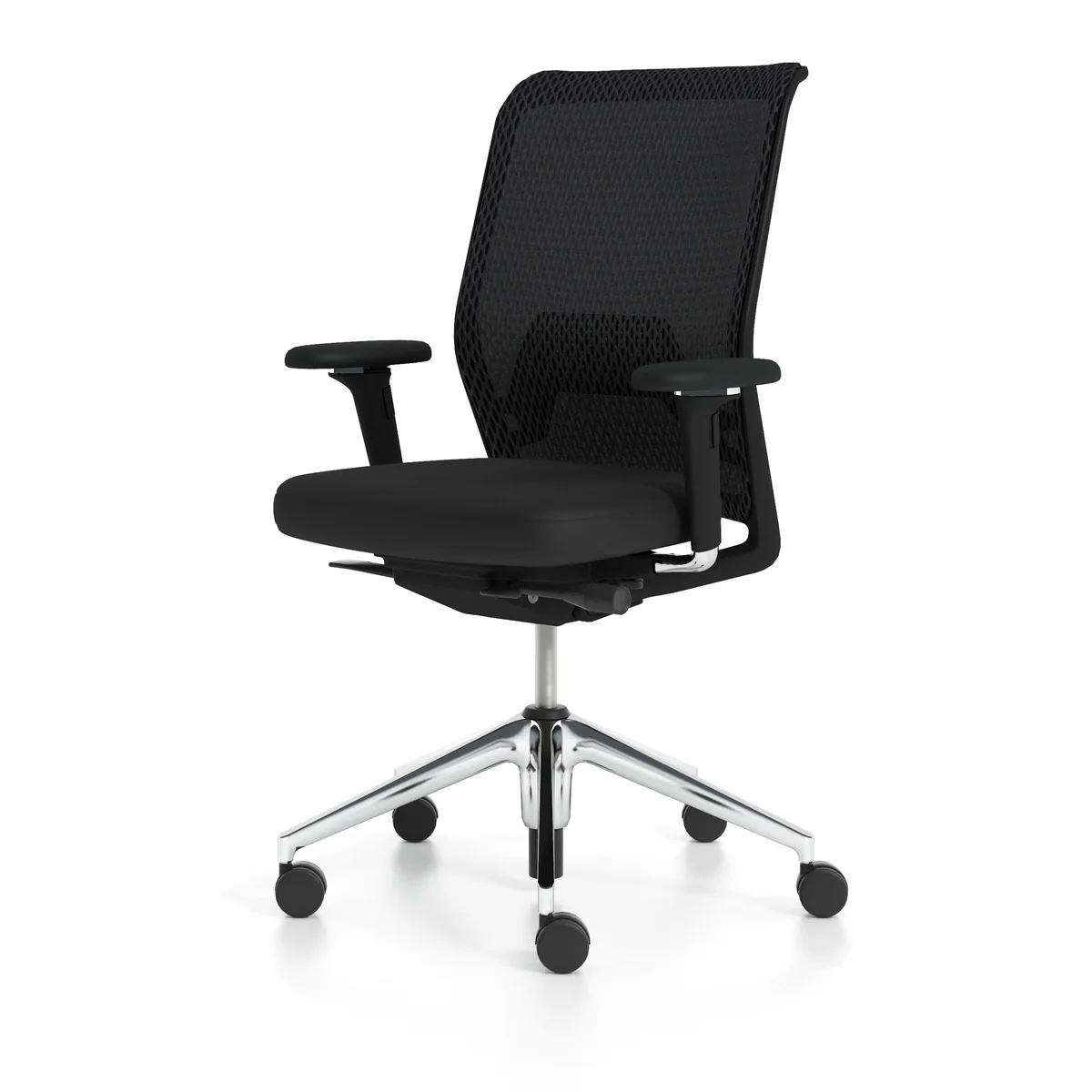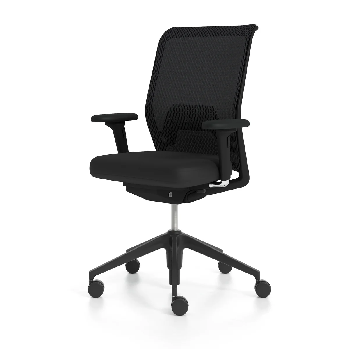 The back of the ID Mesh , consisting of the two plastic parts stirrup and lumbar support, provides support in the lumbar area and flexibility in the upper area of the backrest. The frame is covered with the upholstery fabric Diamond Mesh or Silk Mesh attached. Silk Mesh and Diamond Mesh are three-dimensional spacer fabrics which, due to their depth and structure, accommodate the user in their contours. Diamond Mesh with its expressive graphic structure is light, transparent and air-permeable, yet comfortable like a thin cushion. Silk Mesh is visually closed, but offers the same features. The integrated lumbar support can be adjusted in height to the contour of the back.