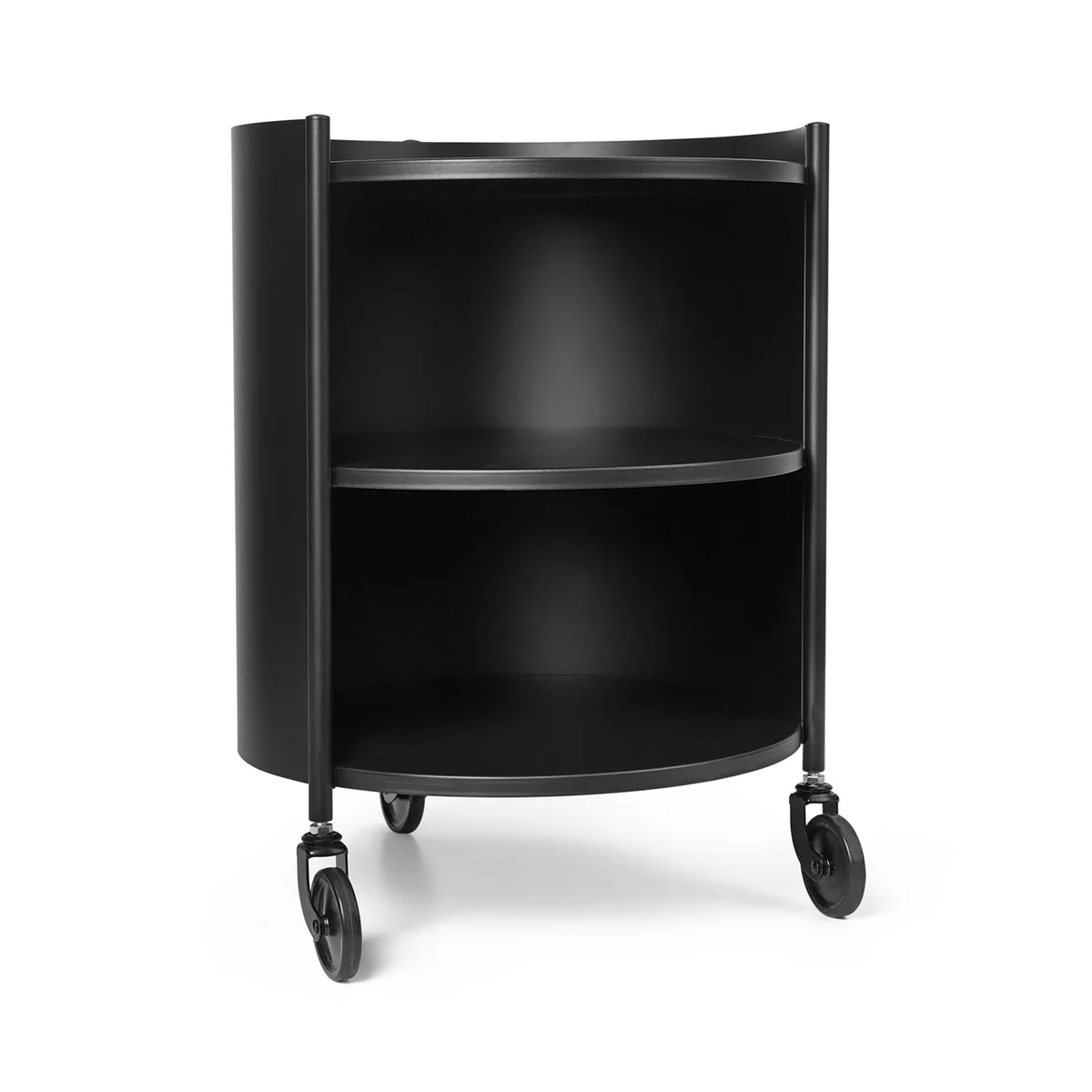 Eve Storage is a versatile piece of furniture made of sturdy, powder-coated steel with three shelves, two of which are partially hidden behind the slim frame, which features an attractive cylindrical shape and three large wheels. Place a table lamp on the top shelf and use Eve Storage as a practical nightstand, use it in the living room as a stylish side table or in the office to store your essentials. Thanks to the functional wheels Eve Storage can be conveniently moved from one room to another, fulfilling all your storage needs.