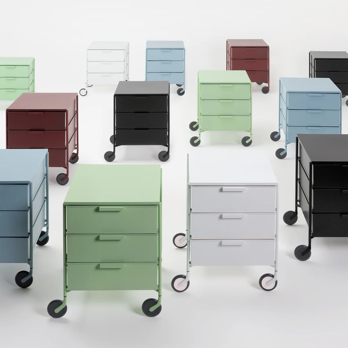 The Mobil roll container by Antonio Citterio and Oliver Löw for Kartell characterized by its functionality and robust construction. The rolling drawer cabinet is light and versatile due to its flexibility. Whether in the living room, in the bedroom or in the office - sorting and tidying is easy with the container furniture, because the practical helper with its three drawers offers enough space for documents and other utensils.