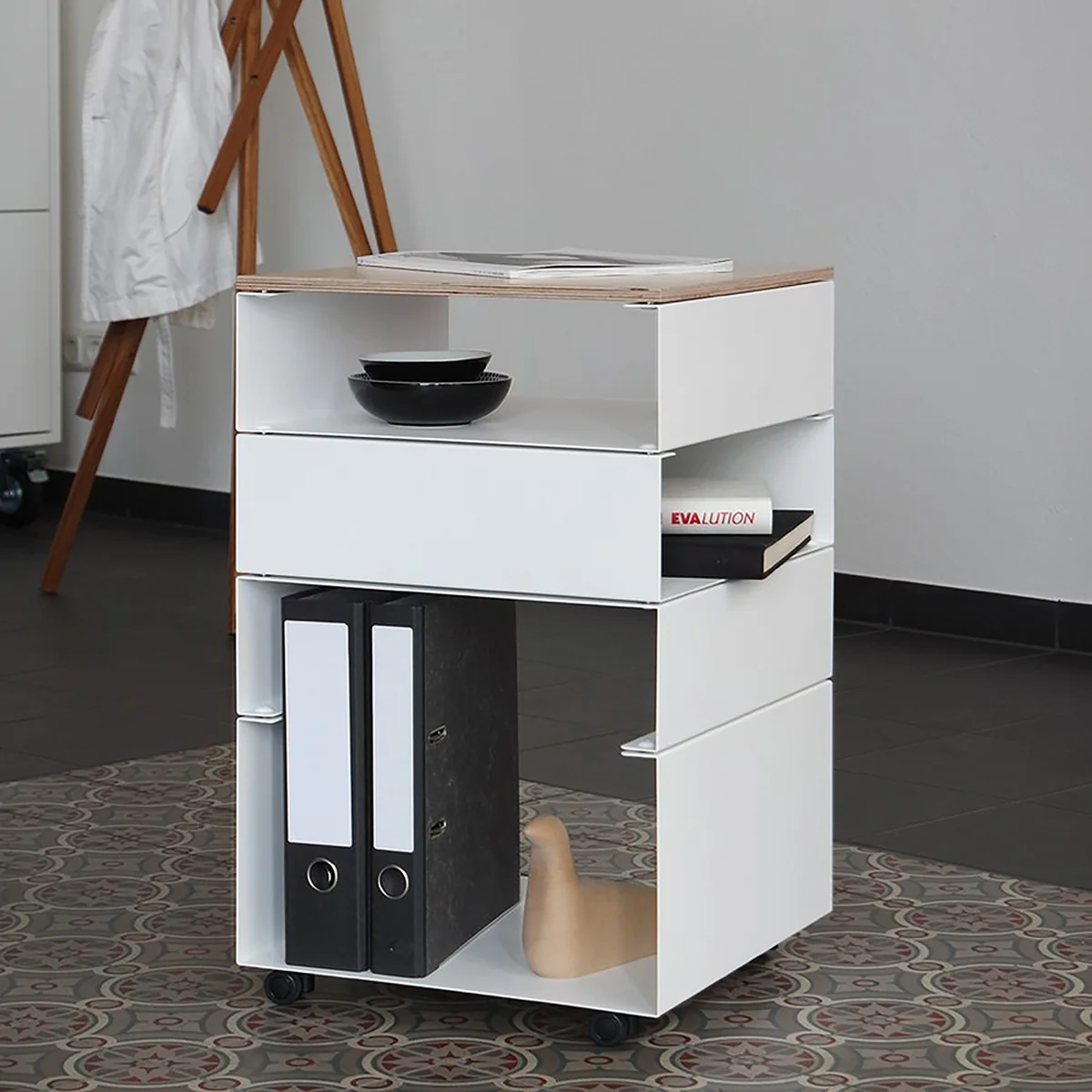 Thanks to its four wheels, Rolf is particularly versatile and can be used wherever it is needed. It can serve as a filing cabinet in the office, a practical bedside table in the bedroom, a telephone table in the hallway or a bar cart in the living room. Thanks to its discreet design, it is seamlessly introduced into various home decors.