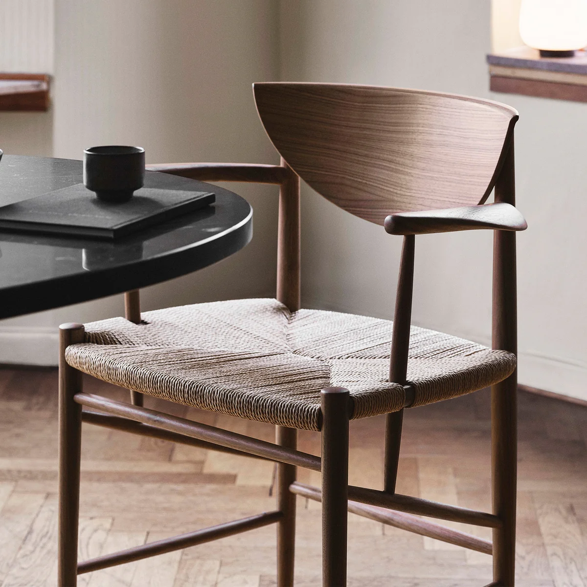 The armchair is made of turned and milled solid wood in oak or walnut with a moulded backrest and comfortable armrests. The seat is hand-woven from more than 100 metres of natural paper cord.