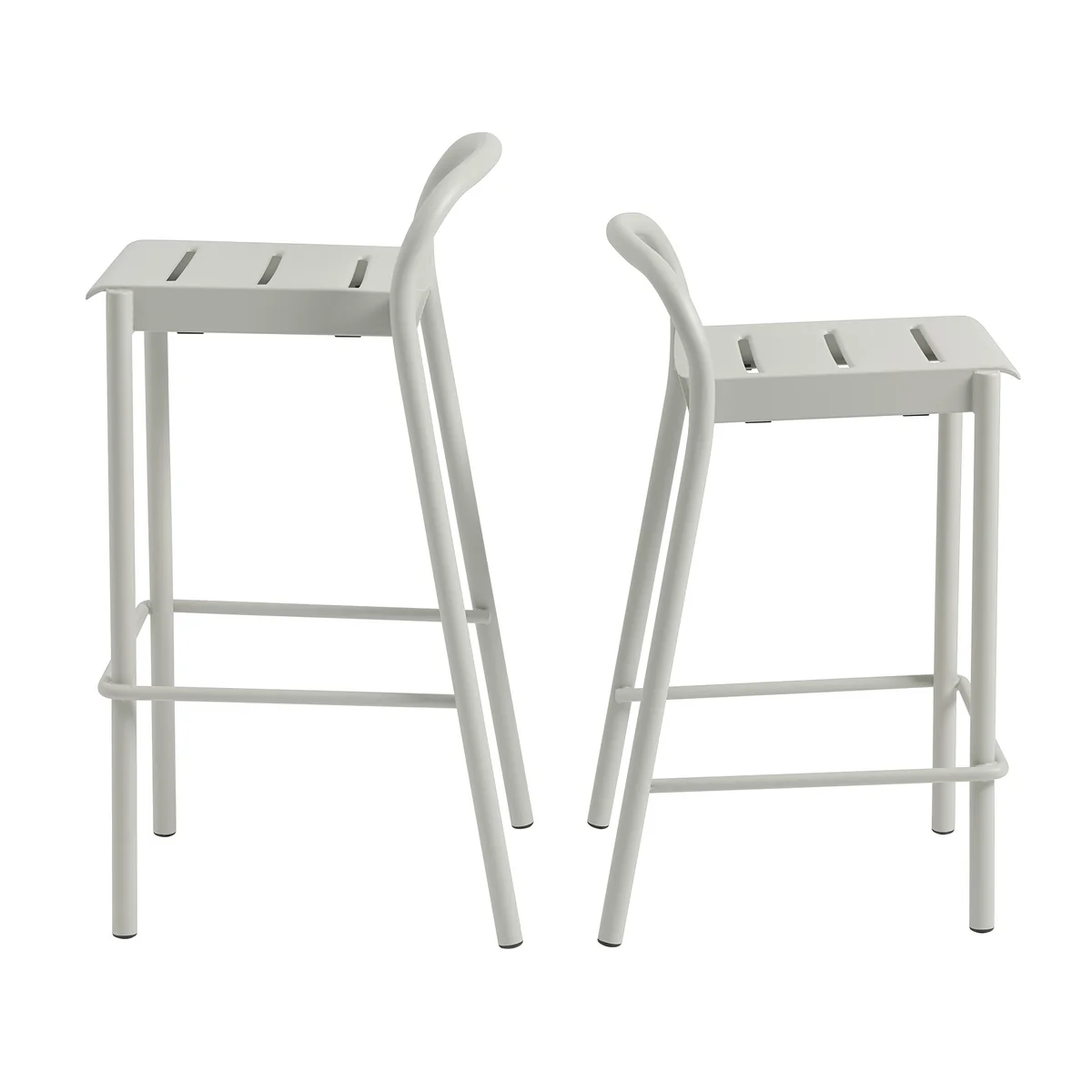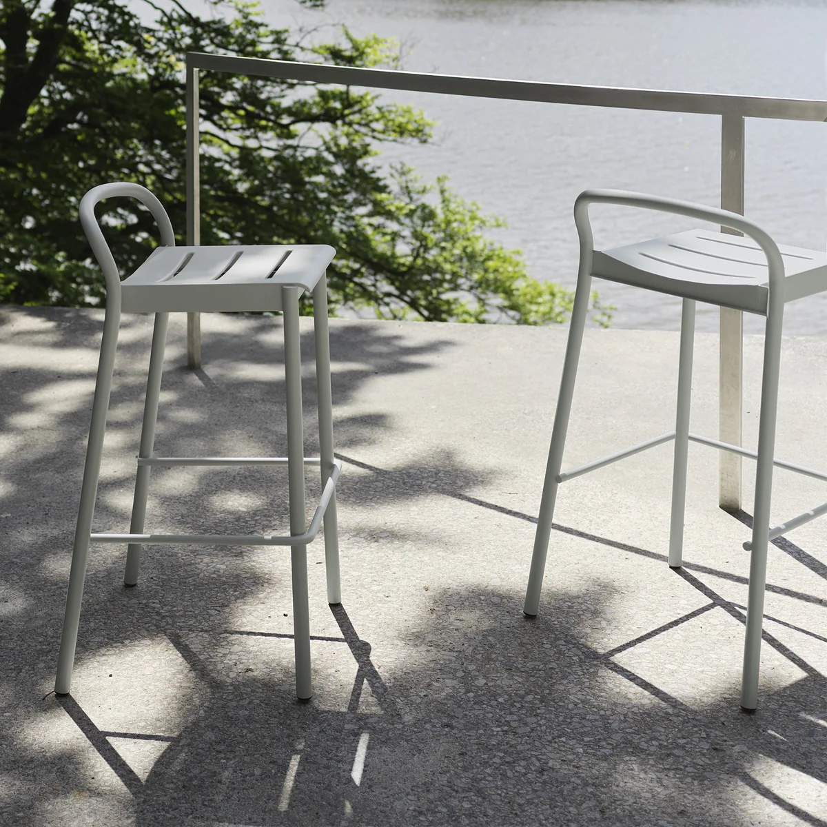 The Linear Steel Outdoor Bar Stool from Muuto is kept visually clean with clean lines to ensure a long-lasting aesthetic. Its contrast of curved back and straight legs provides a modern expression on private and public patios, balcony and garden.