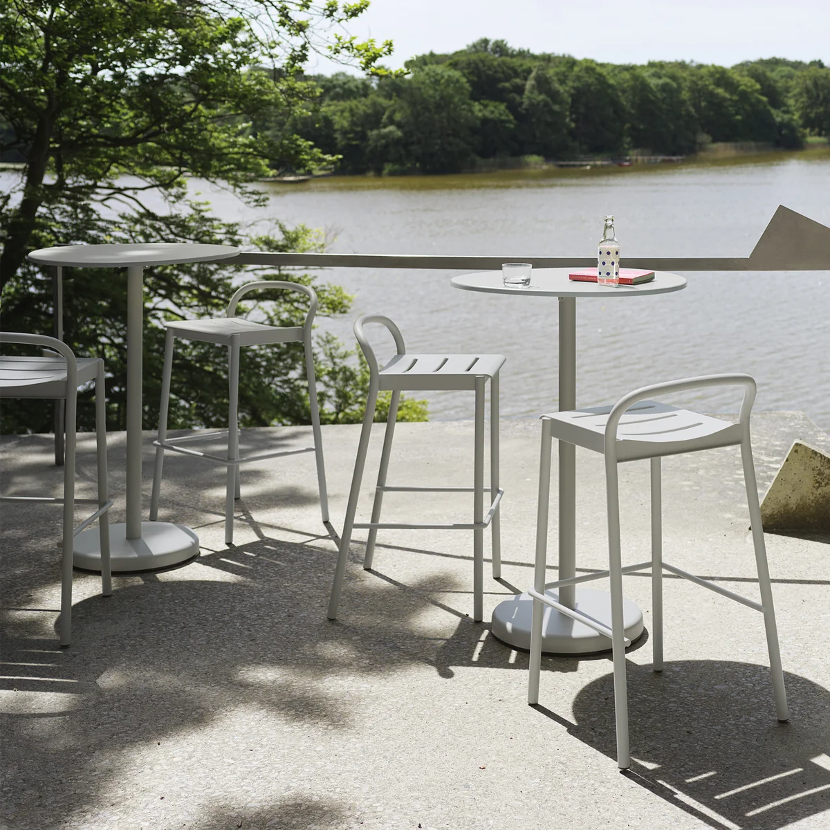 The bar stool is made of galvanized steel and then finished with a weather-resistant, deep matte, UV-resistant powder coating. The legs are equipped with plastic glides so they can be used outdoors without damage. Up to five bar stools can be easily stacked.